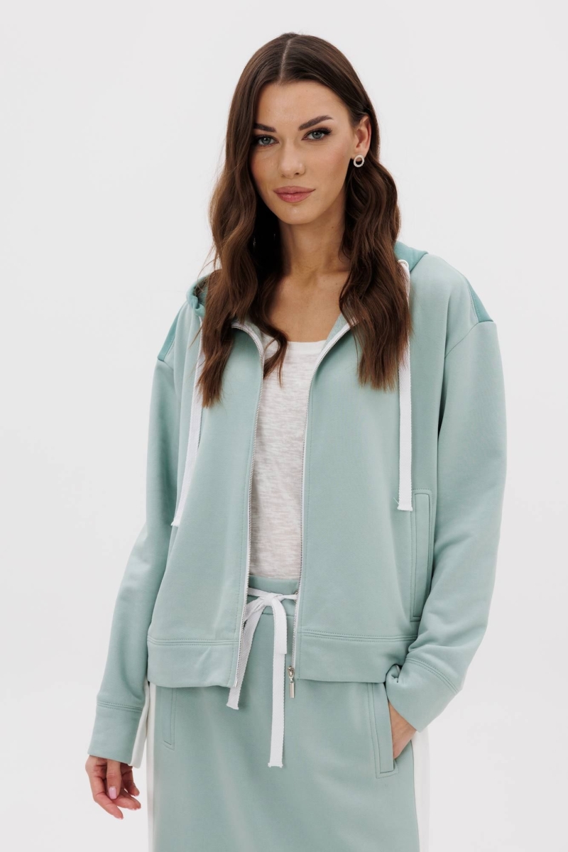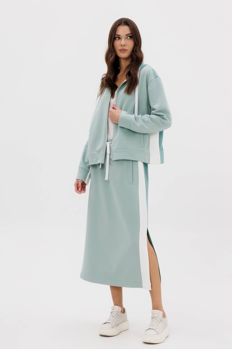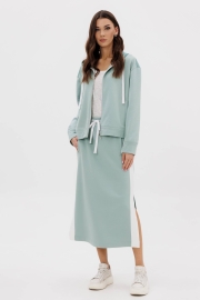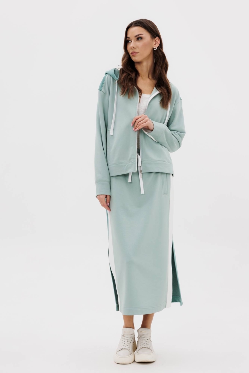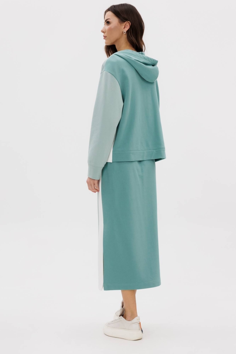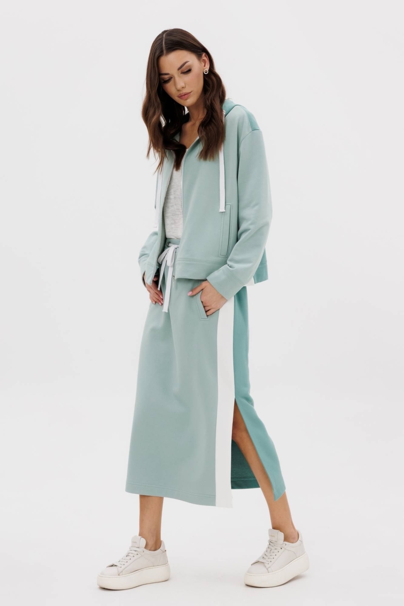Перед тем, как отправиться на прогулку, шоппинг или активный вид отдыха, каждая из нас задумывается об одежде, которая будет практичной и одновременно стильной. Толстовка свободного силуэта, рубашечного покроя с заниженной линией плеча, рукавом, расширенным в области оката, на притачной манжете, центральной застёжкой на тесьму-молнию и капюшоном с люверсами и отделочным шнуром. Полочка с прорезным карманом с листочкой. По низу изделия - притачной пояс. Прямая удлиненная юбка. По боковым швам - разрезы. На переднем полотнище боковой карман с листочкой. Пояс - эластичный с отделочными люверсами и шнуром. Длина юбки около 80 см