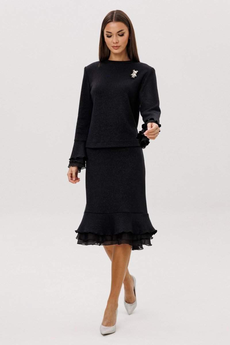 Изящный юбочный комплект из мягкого вискозного трикотажа с деликатным вкраплением люрекса — воплощение утончённости и женственности.