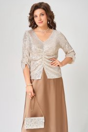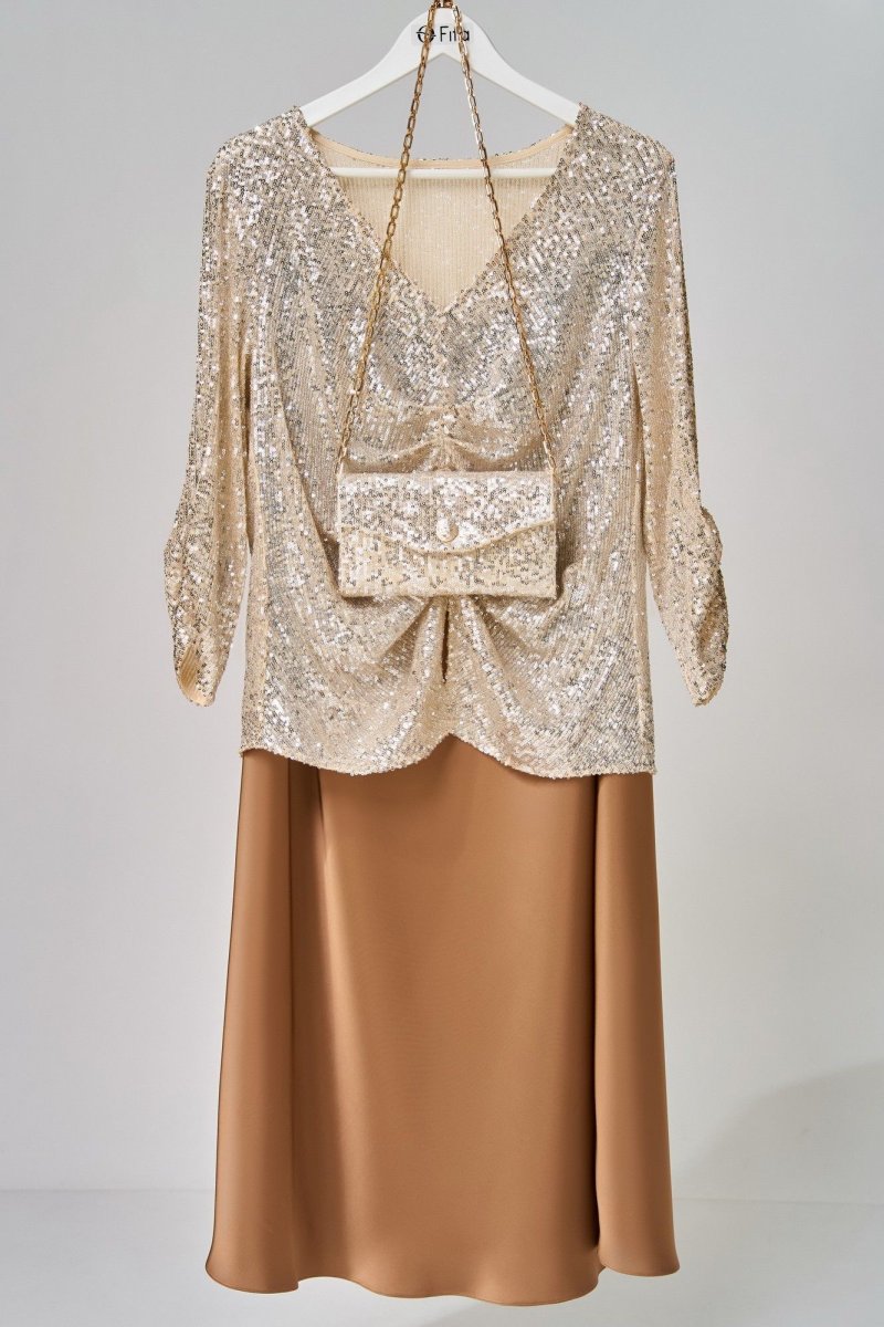 "Зария" — сияющий акцент вашего новогоднего образа. Блузка, расшитая пайетками, ловит свет при каждом движении, а сатиновая юбка добавляет торжественности и утончённости. Идеальный дуэт для праздников, когда хочется блистать. К этому комплекту в продаже есть сумочка.