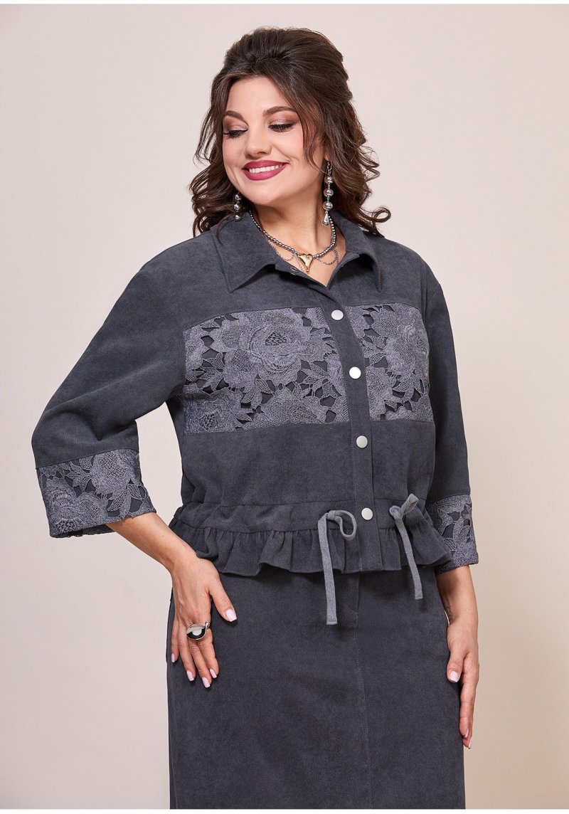 Женский комплект состоящий из жакета и юбки, выполнены из штрукса и декорированы гипюром. Жакет свободного покроя, горловина обработана воротником рубашечного типа, на полочке выполнен подрез с вставкой из кружева. Ниже линии талии втачной пояс с резинкой и кулисой, от пояса вниз притачена присборенная баска из основной ткани. Застежка на планку с пуговицами, спинка также с втачным поясом и присборенной баской. Рукав на спущенной пройме, втачной, по низу манжета декорирована кружевом. Юбка выполнена из штрукса, верхний срез обработан притачным поясом. По переднему полотнищу выполнен средний шов, сверху застежка на молнию и пуговицу, в боковых обработаны карманы. Заднее полотнище со средним швом, по низу шлица. Также на заднем полотнище обработана кокетка и накладные карманы. Комплект в спортивном стиле это незаменимая база для вашего гардероба!