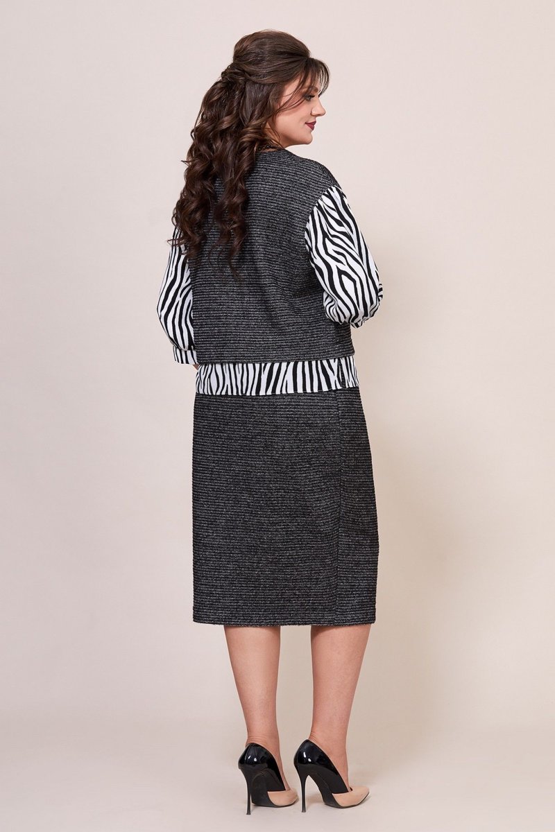 Стильный, женский комплект полу-прилегающего покроя, выполнен из трикотажного полотна, состоит из блузы и юбки. Блуза выполнена из трикотажного полотна, в качестве отделки используется плательная ткань с принтом. Горловина округлой формы, на обтачке, по низу блузы выполнена имитация рубашки, притачена плательная ткань, по боковым швам разрезы. Рукав спущенного покроя, выполнен из плательной ткани с принтом, присборен по окату и по низу на манжет. Спинка идентична полочке, также в качестве декора на полочке съемная брошь ручной работы. Юбка трикотажная, прямого покроя, верхний срез на поясе с резинкой. Элегантный и в то же время удобный комплект станет вашим любимчиком для любого мероприятия!