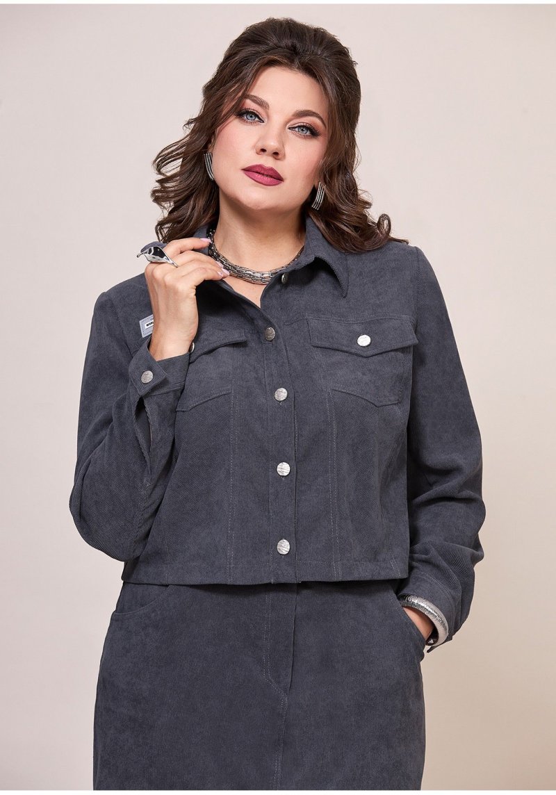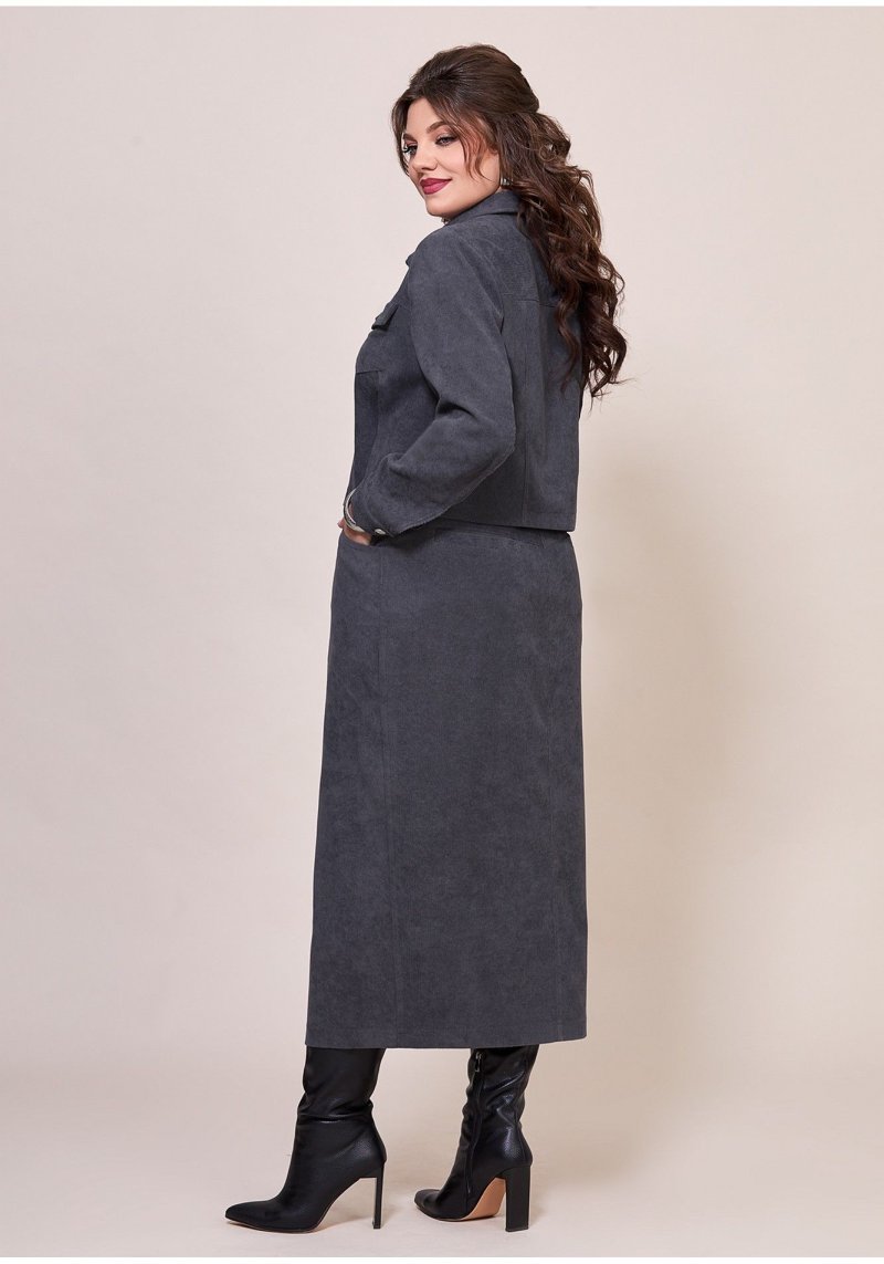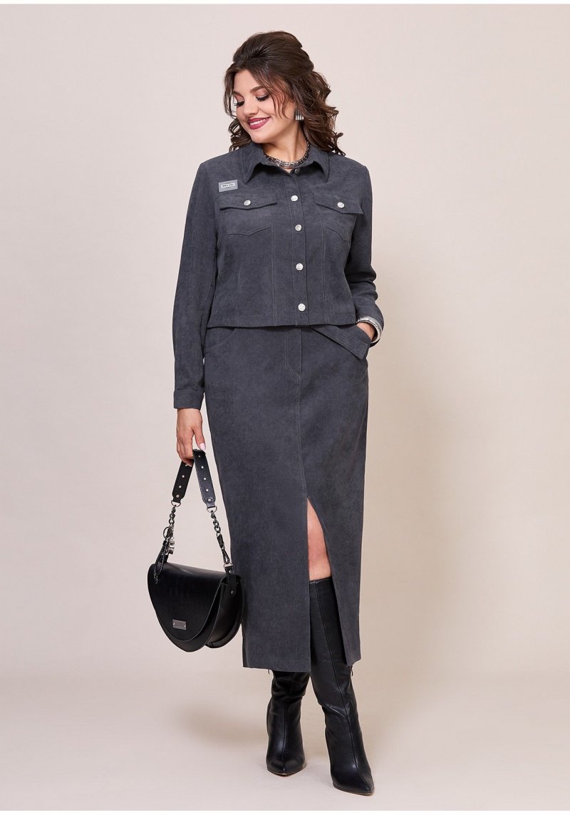 Женский комплект состоит из укороченного жакета и юбки, полу-прилегающего силуэта, выполнен из штрукса. Жакет с застежкой по переду на планку с петлями-пуговицами, горловина обработана втачным воротником на стойке. По полочке обработаны кокетки и рельефы, в рельефах накладные карманы с клапаном, кокетка декорирована нашивкой. Рукав втачной, длинный, по низу с разрезом, на манжете с застежкой на пуговицу. Спинка выполнена из основной ткани, с кокеткой и рельефами. Юбка слегка заужена к низу, верхний срез обработан притачным поясом, застежка спереди на молнию, по поясу на пуговицу. Также по переду обработаны карманы в боковых швах, средний шов, по низу шва разрез. На заднем полотнище юбки обработаны кокетки и прорезные карманы с листочкой, также на заднем полотнище обработан средний шов. К юбке в комплекте прилагается съемный пояс с пряжкой, выполнен из основной ткани. Стильный комплект, выполнен в современном стиле отличный выбор, чтобы быть в тренде!