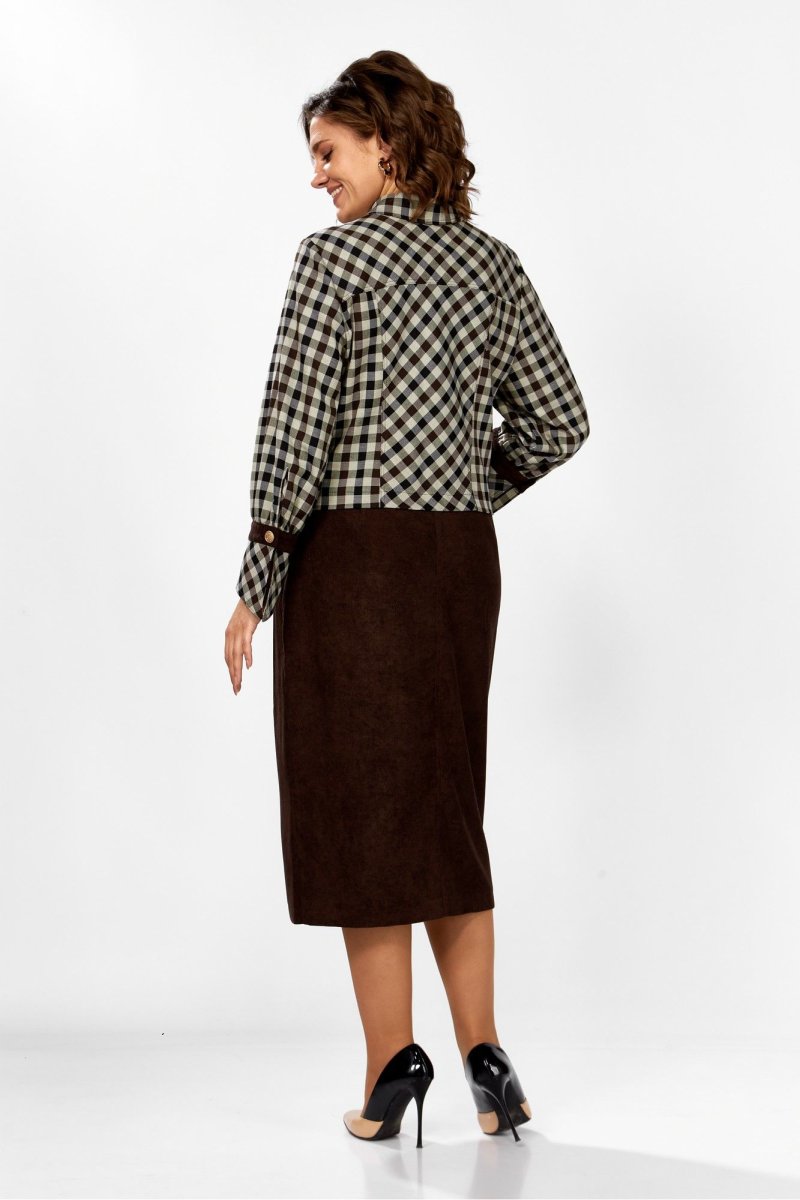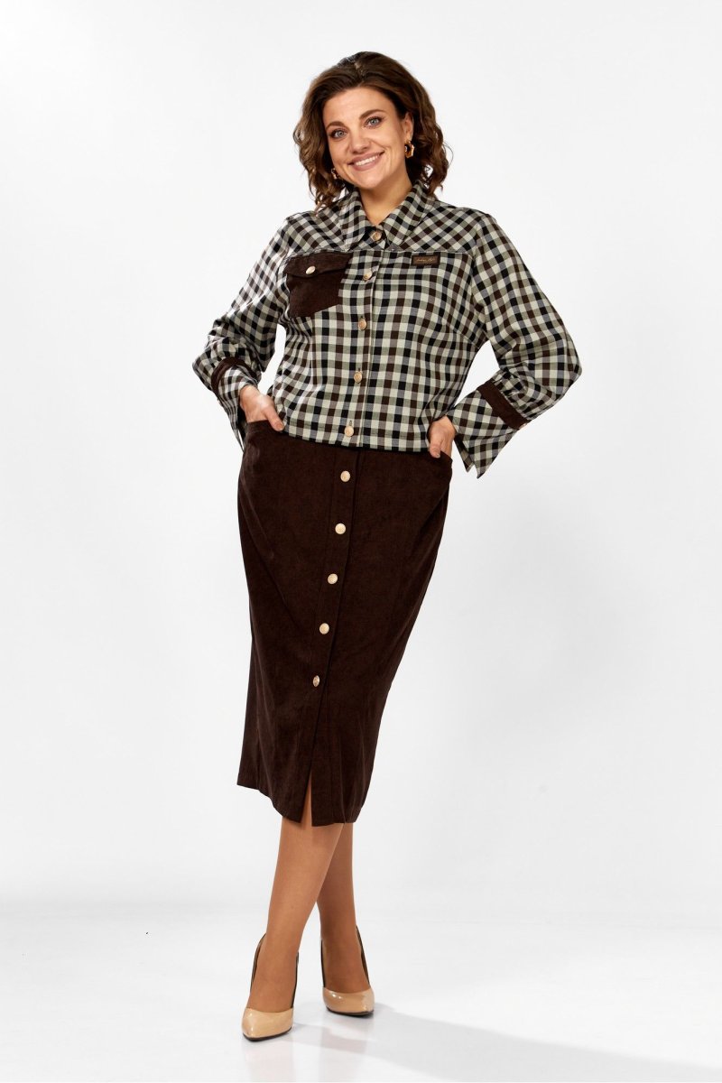 Женский комплект, состоит из жакета и юбки. Жакет выполнен из текстильной ткани в клетку, в качестве отделки штрукс. Горловина обработана воротником со стойкой, застежка по переду на пуговицы. На полочке обработаны рельефы и кокетки, также на полочке обработан накладной карман с клапаном из штрукса по одной стороне, по второй нашивка. Спинка идентична полочке, рукав втачной, по низу с манжетой из штрукса и текстиля в клетку, застегивается на пуговицу. Юбка выполнена из штрукса, с застежкой по переду на планку с пуговицами. Верхний срез обработан притачным поясом, по переду обработаны вертикальный подрезы и карманы. Заднее полотнище юбки со средним швом и вытачками. Эффектный и стильный комплект для вашего осеннего образа!