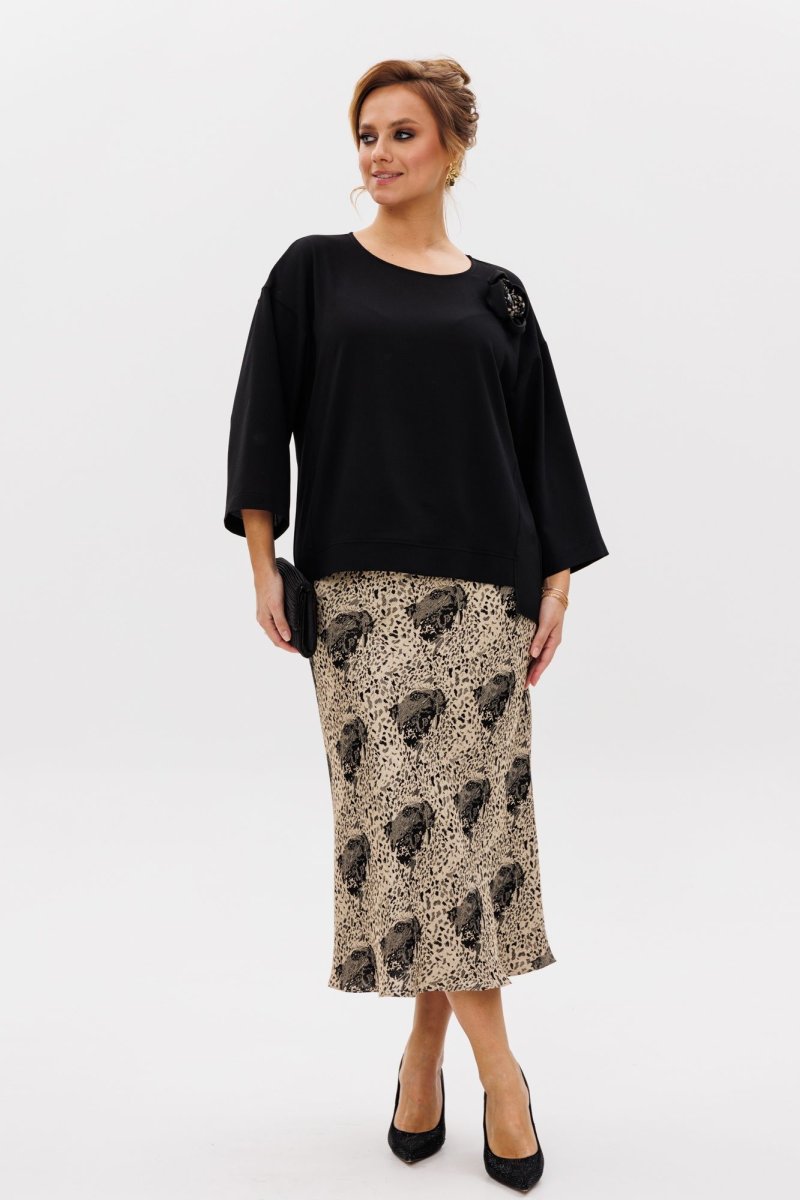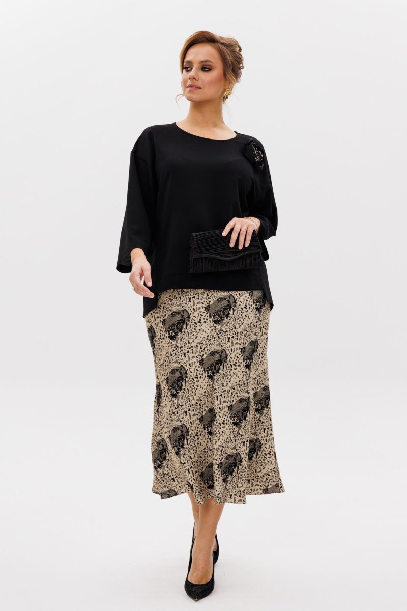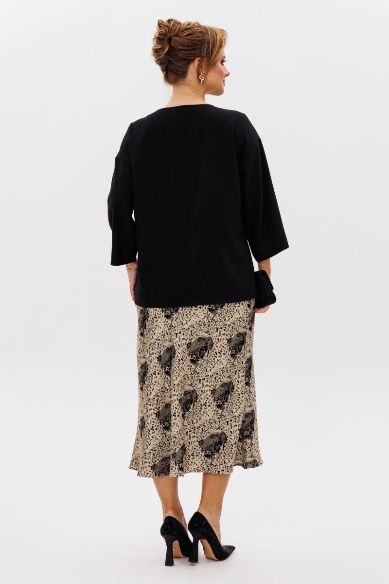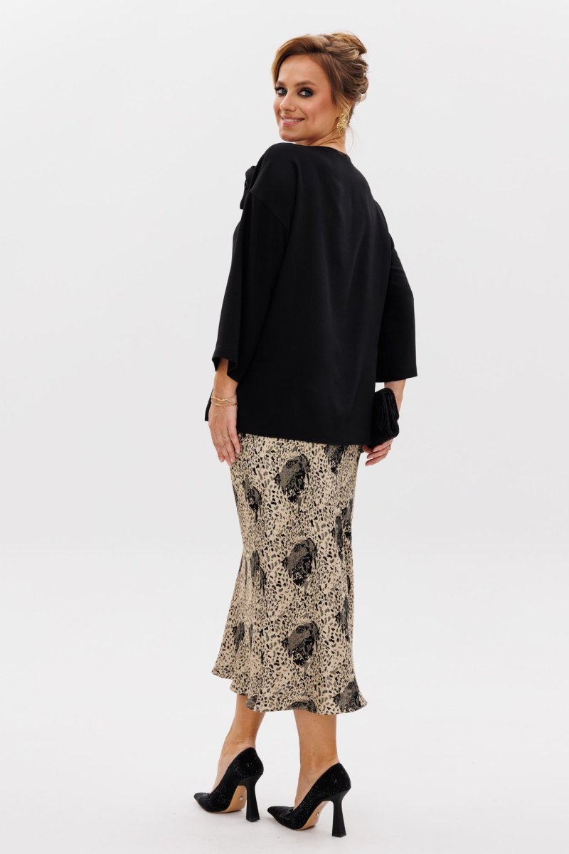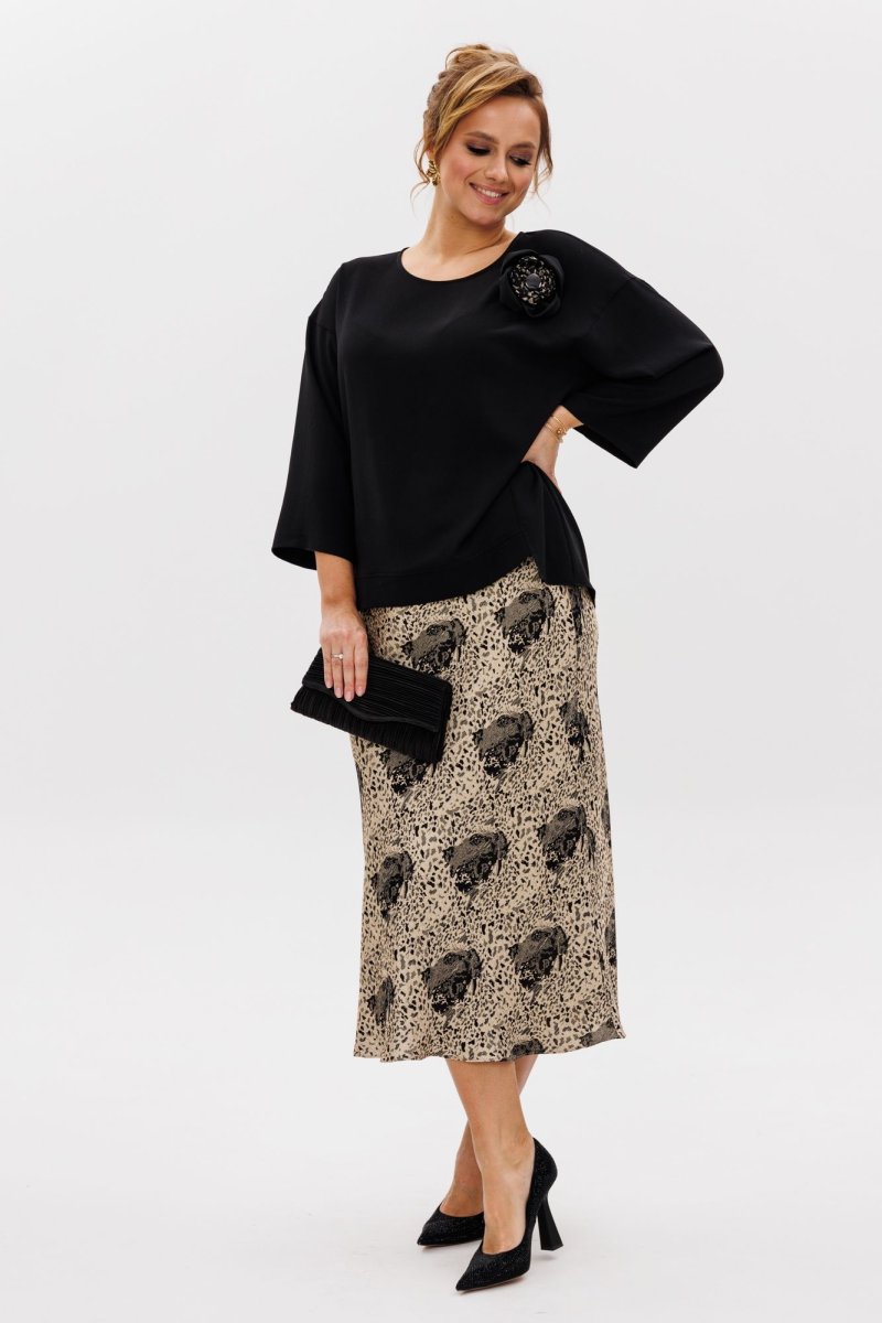 Нарядный женский комплект, состоящий из блузы и юбки. Блуза прямого свободного силуэта, выполнена из блузочного крепа (тянется) со спущенной линией плеча. Вырез горловины округлой формы, обработан окантовкой. По переду отрезные бочки и притачная планка. Низ фигурный, разноуровневый по длине. Рукава одношовные. Блуза декорирована съемным цветком. Юбка расширенная к низу, выполнена из облегченного жаккарда (тянется). Верхний срез оформлен поясом с эластичной резинкой.