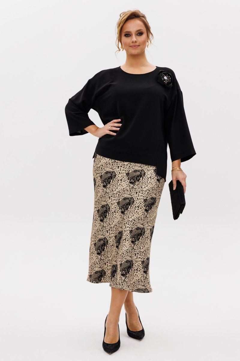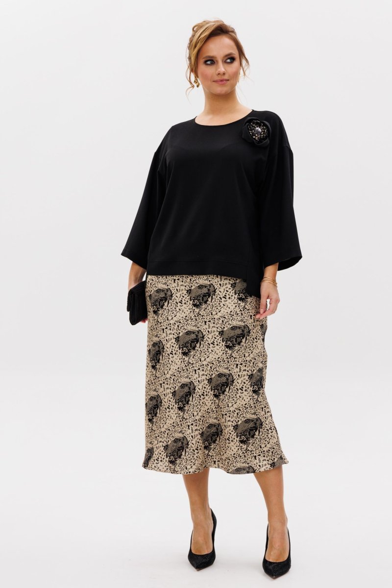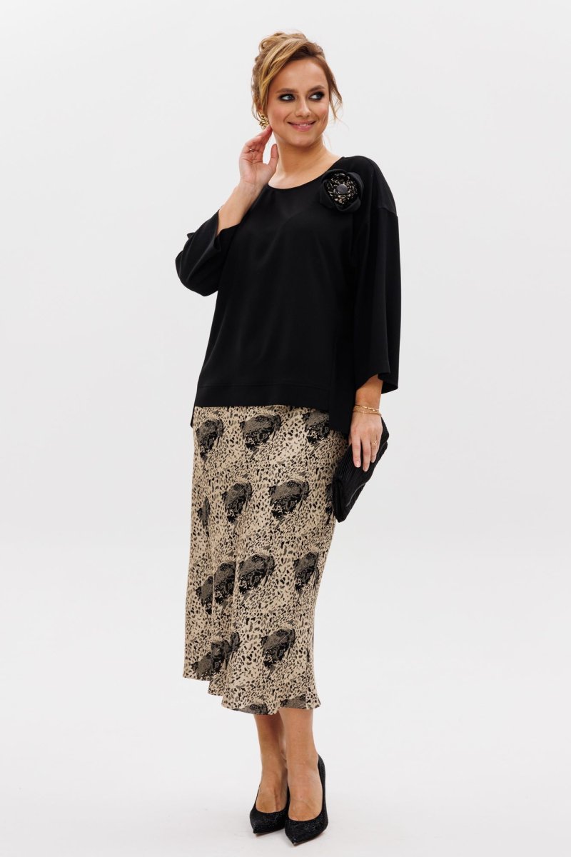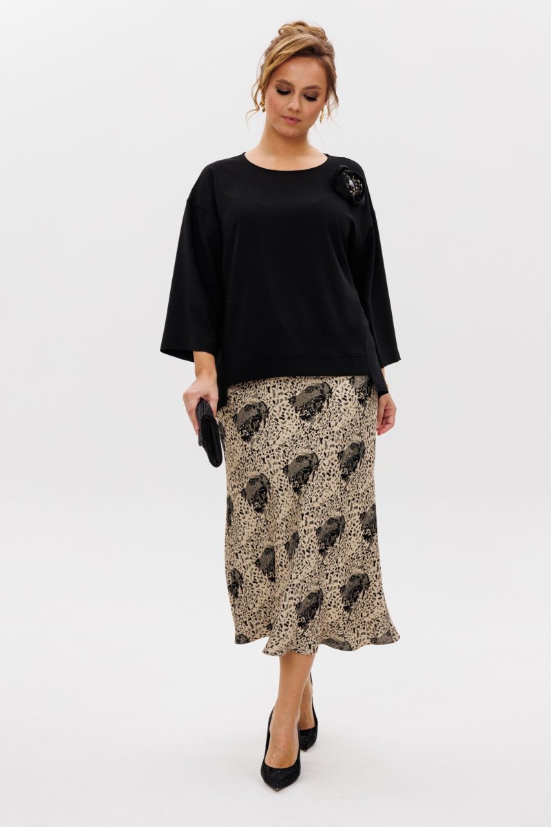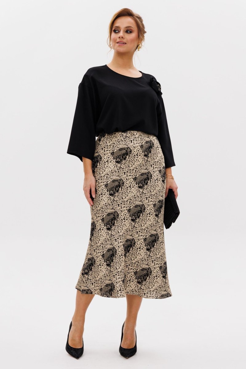 Нарядный женский комплект, состоящий из блузы и юбки. Блуза прямого свободного силуэта, выполнена из блузочного крепа (тянется) со спущенной линией плеча. Вырез горловины округлой формы, обработан окантовкой. По переду отрезные бочки и притачная планка. Низ фигурный, разноуровневый по длине. Рукава одношовные. Блуза декорирована съемным цветком. Юбка расширенная к низу, выполнена из облегченного жаккарда (тянется). Верхний срез оформлен поясом с эластичной резинкой.