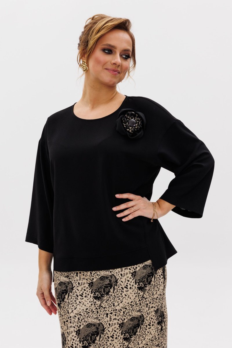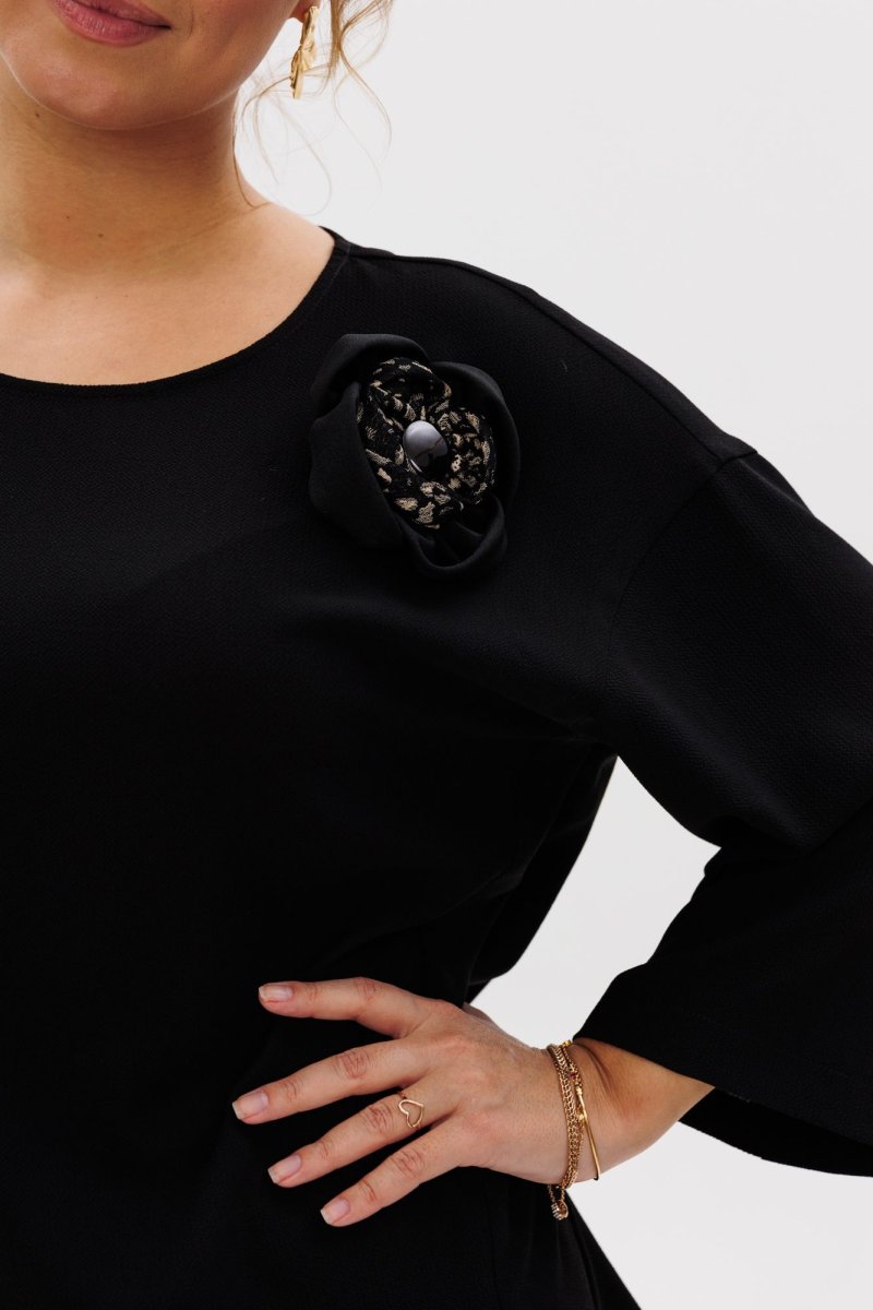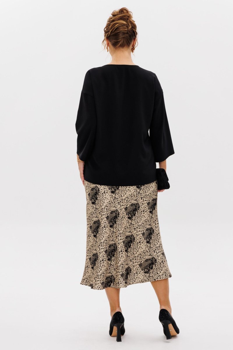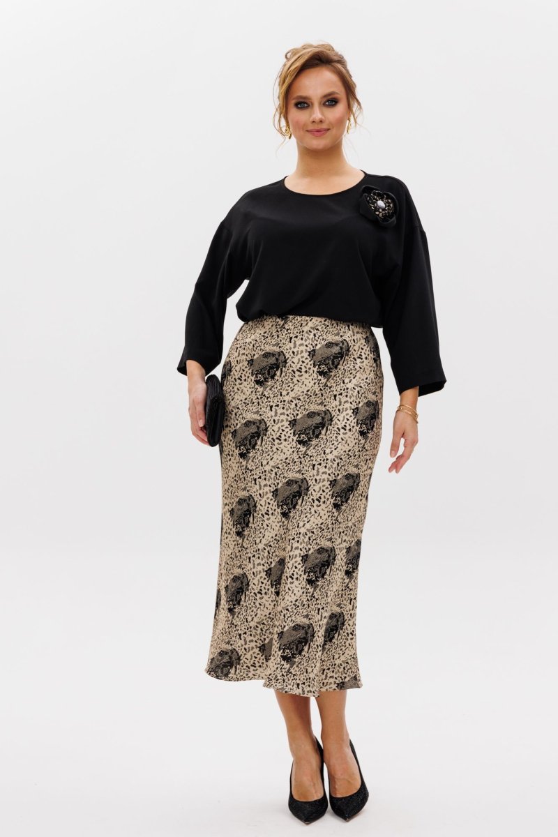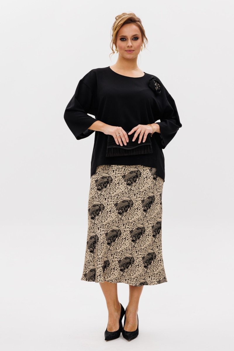 Нарядный женский комплект, состоящий из блузы и юбки. Блуза прямого свободного силуэта, выполнена из блузочного крепа (тянется) со спущенной линией плеча. Вырез горловины округлой формы, обработан окантовкой. По переду отрезные бочки и притачная планка. Низ фигурный, разноуровневый по длине. Рукава одношовные. Блуза декорирована съемным цветком. Юбка расширенная к низу, выполнена из облегченного жаккарда (тянется). Верхний срез оформлен поясом с эластичной резинкой.
