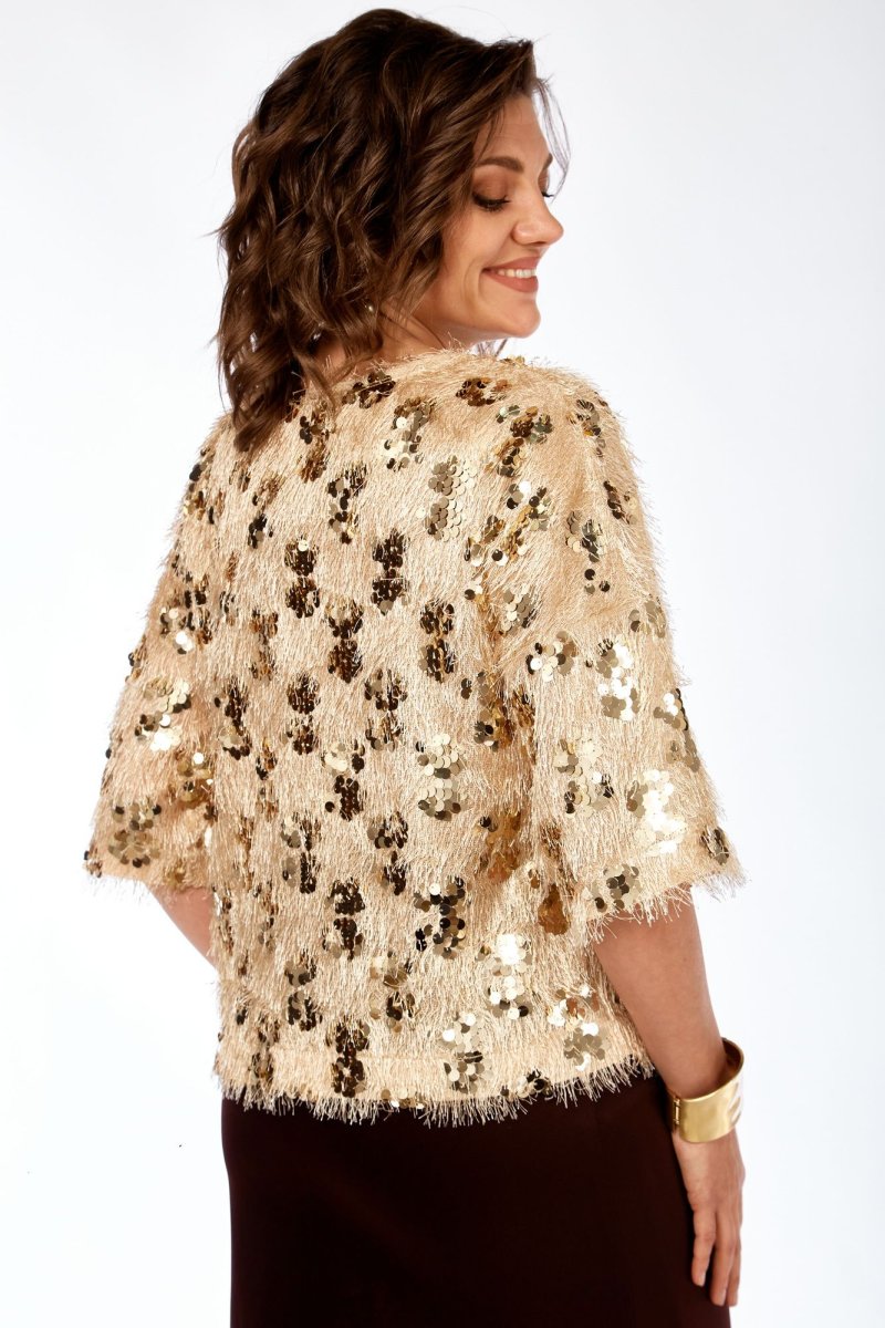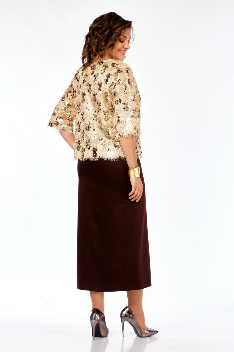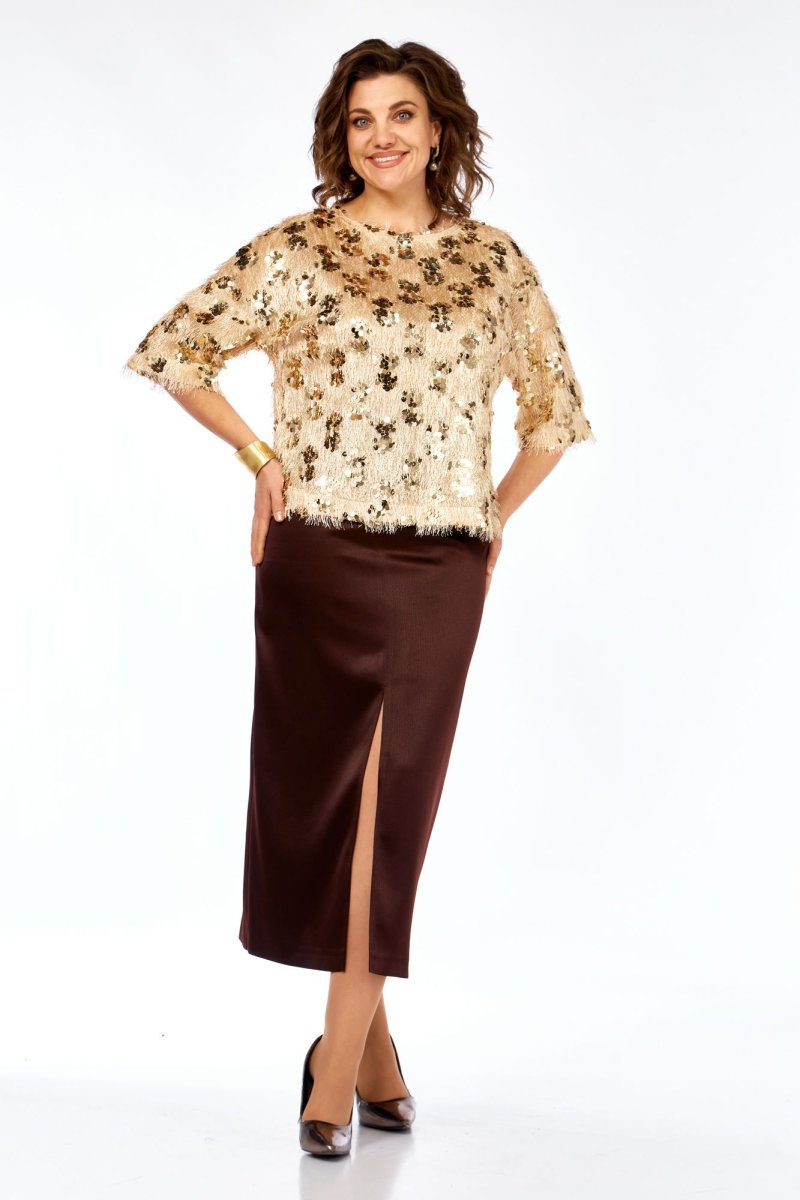 Шикарный комплект, сочетающий мягкую бахрому с пайетками и атлас -must-have сезона. Блузка нарядная прямого силуэта, из интересной ткани с бахромой и паетками. Вырез горловины округлой формы, со спущенным рукавом длиной 3/4. Юбка длиной миди на поясе (резинка по бокам) из атласной ткани. По спинке средний шов, в который вставлена потайная молния, разрез по центру по полочке.