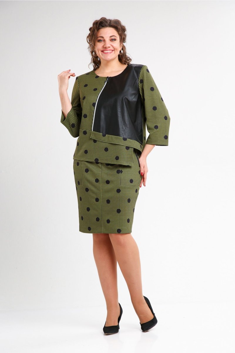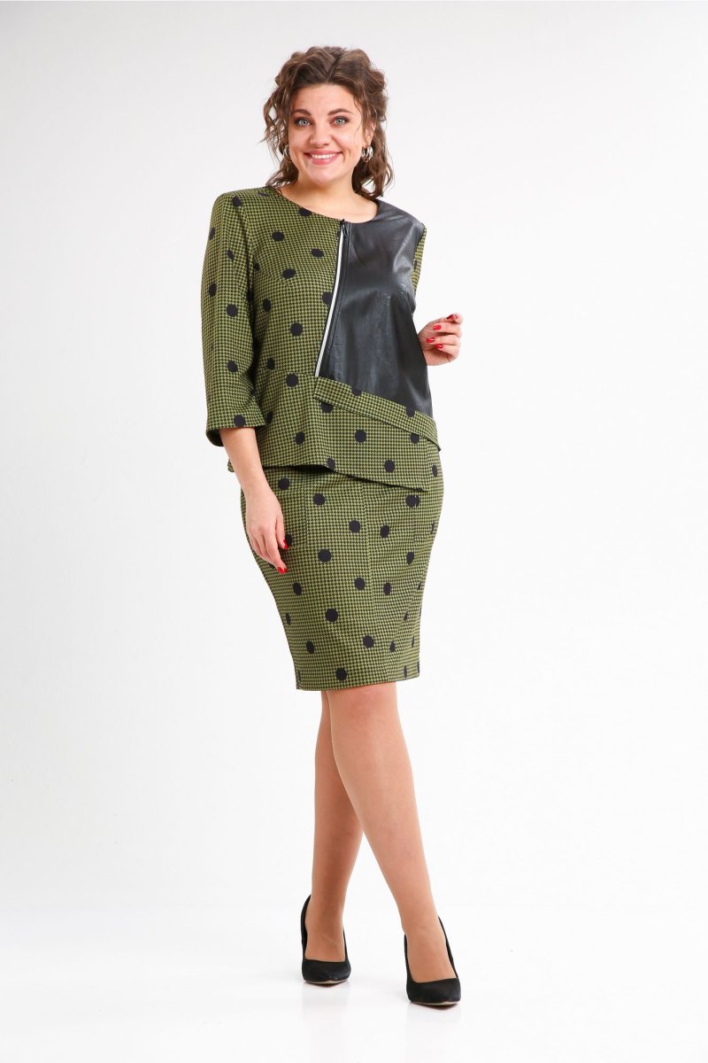 Комплект женский 2-х предметный, состоящий из юбки и блузы, изготовлен из эластичного трикотажного полотна средней плотности. Блузка ассиметричная, со вставкой из экокожи и косой декоративной молнией, которые придают изысканность и шарм изделию. Перед блузки с нагрудными выточками и отрезной баской. Вырез горловины округлый. Спинка с талиевыми выточками и ассиметричной баской. Рукав одношовный втачной длиной 3/4. Юбка прямая из трикотажного полотна на подкладке. Перед юбки с подрезами и листочками, а спинка - со средним швом и молнией. Верх переда и спинки обработан обтачкой-кокеткой. Комплект подарит повседневный комфорт и сделает образ ярким, интересным и незабываемым.