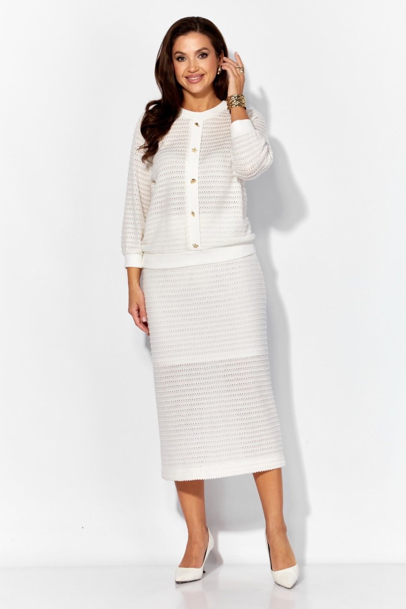 Комплект женский, 2х предметный, состоящий из джемпера и юбки, выполнен из трикотажного полотна(вязка) Джемпер прямого силуэта с рукавом покроя "реглан" длинной 3/4. Низ рукава и джемпера на манжете. Горловина круглой формы, с подрезной бейкой. По центру переда отлетная планка (имитация застежки) с отделочными пуговицами. Юбка прямая, на трикотажной подкладке. Пояс цельнокройный, на резинке по кругу. Фурнитура на изделии может отличаться от фотографии.