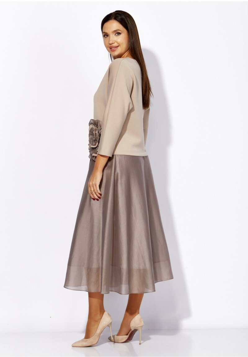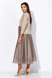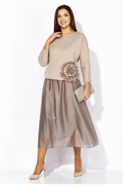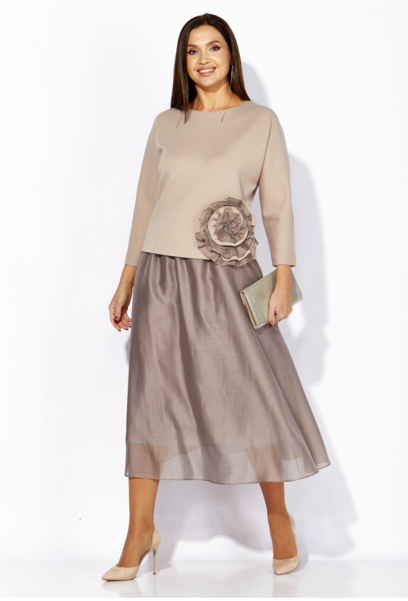 Комплект женский, 2х предметный, состоящий из блузки и юбки. Блузка полуприлегающего силуэта с цельнокройным рукавом длинной 3/4. Выполнена из трикотажного полотна "ТЕНСЕЛ". Вырез горловины "лодочка" По низу блузки, слева, декоративный элемент из рюши, в сочетании двух видов ткани. По спинке средний шов. Юбка широкая к низу, из текстильной ткани "вуалька" На подкладке. Пояс притачной с резинкой по кругу.