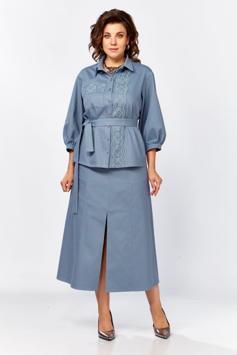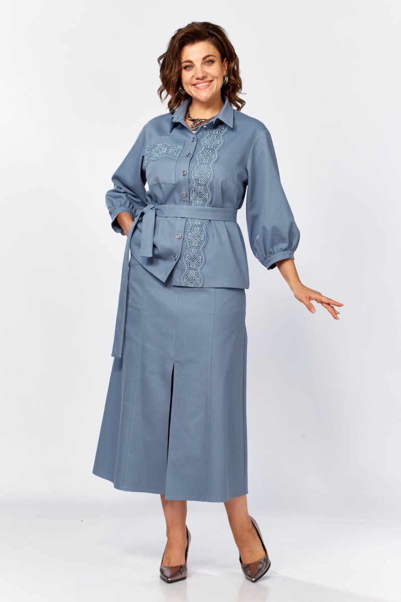 Костюм женский из джинсовой ткани, состоящий из блузы и юбки.