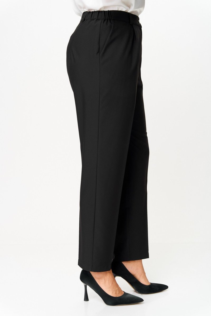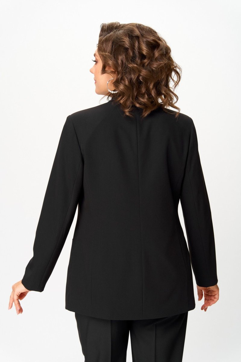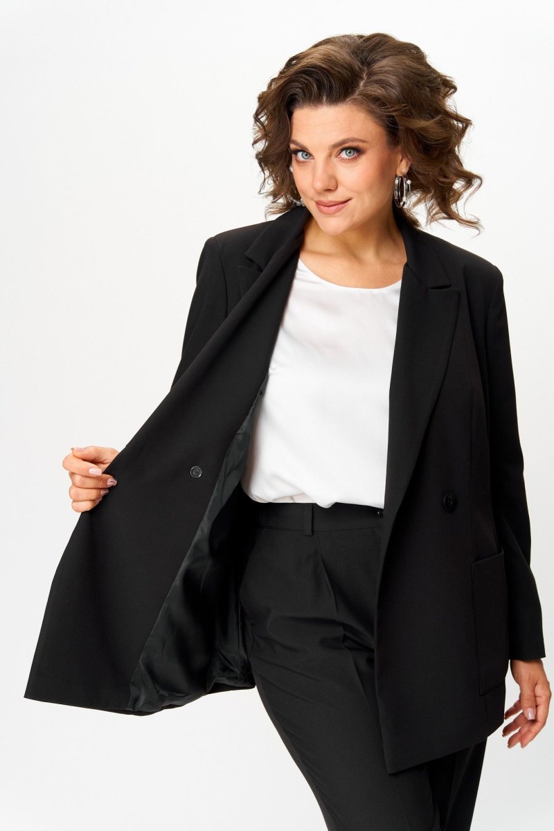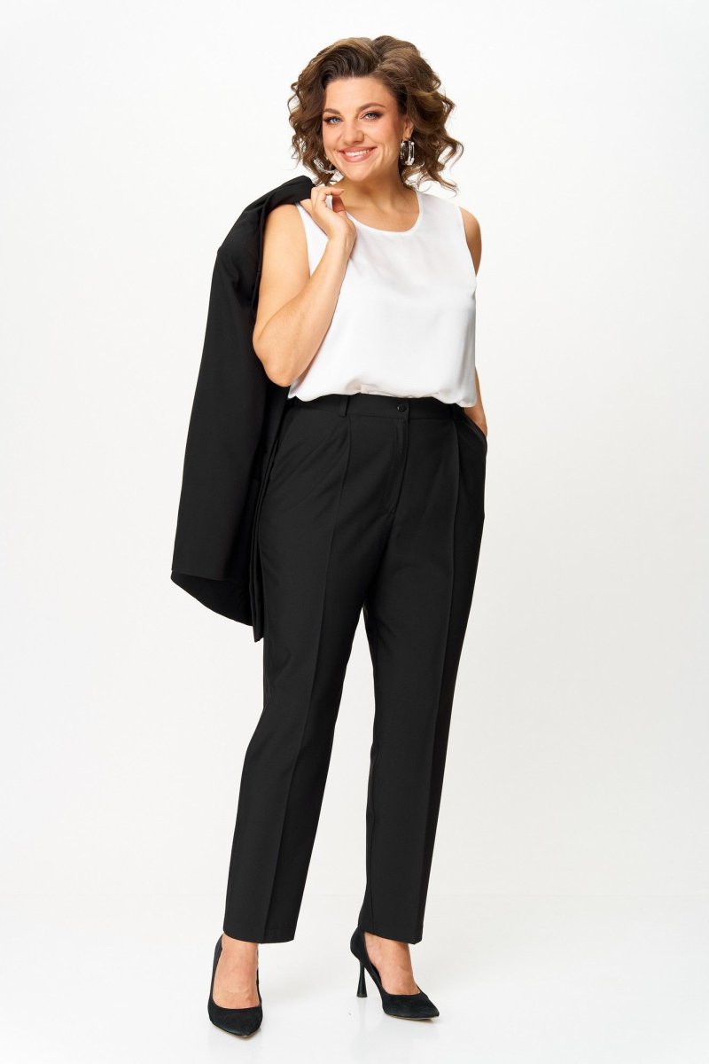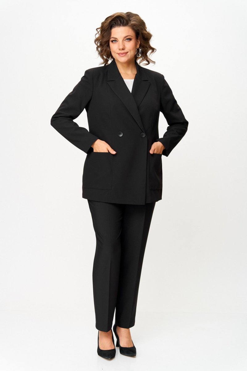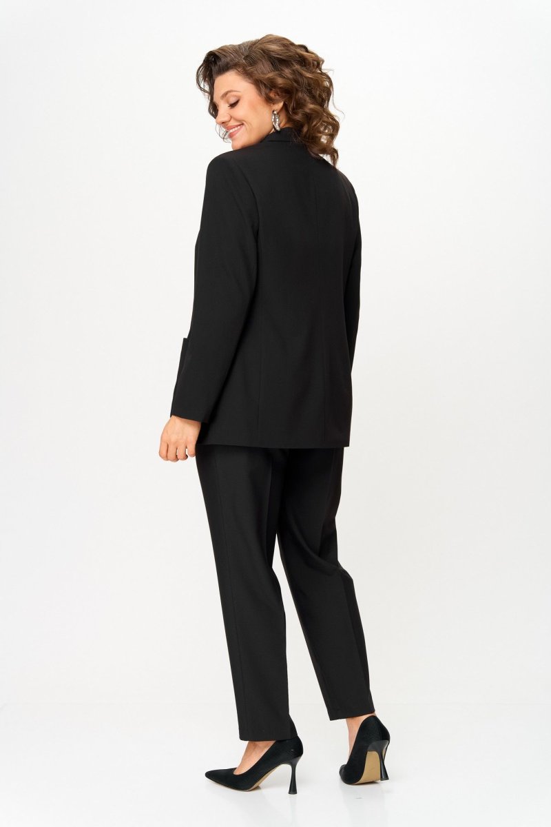Костюм состоит из жакета и брюк. Костюм выполнен из однотонной ткани. Жакет прямого силуэта, НА ПОДКЛАДКЕ. Полочка жакета с вертикальными рельефами и двубортной застежкой на две пуговицы. Горловина V-образной формы. На нижней части полочки выполнены накладные карманы. Спинка со средним швом и отрезными бочками. Рукав длинный, втачной, двухшовный. Брюки со стрелками, зауженные к низу. По передним половинкам выполнены наклонные карманы и складки по талии. По задним половинкам обработаны талиевые вытачки. В среднем шве передней половинки брюк обработана застежка на молнию. Брюки на притачном поясе с эластичной тесьмой и застежкой на петлю и пуговицу.