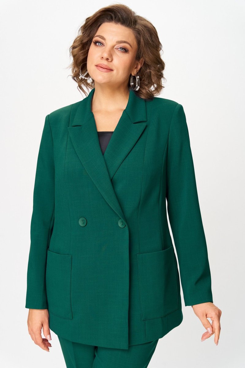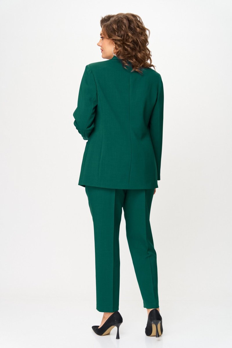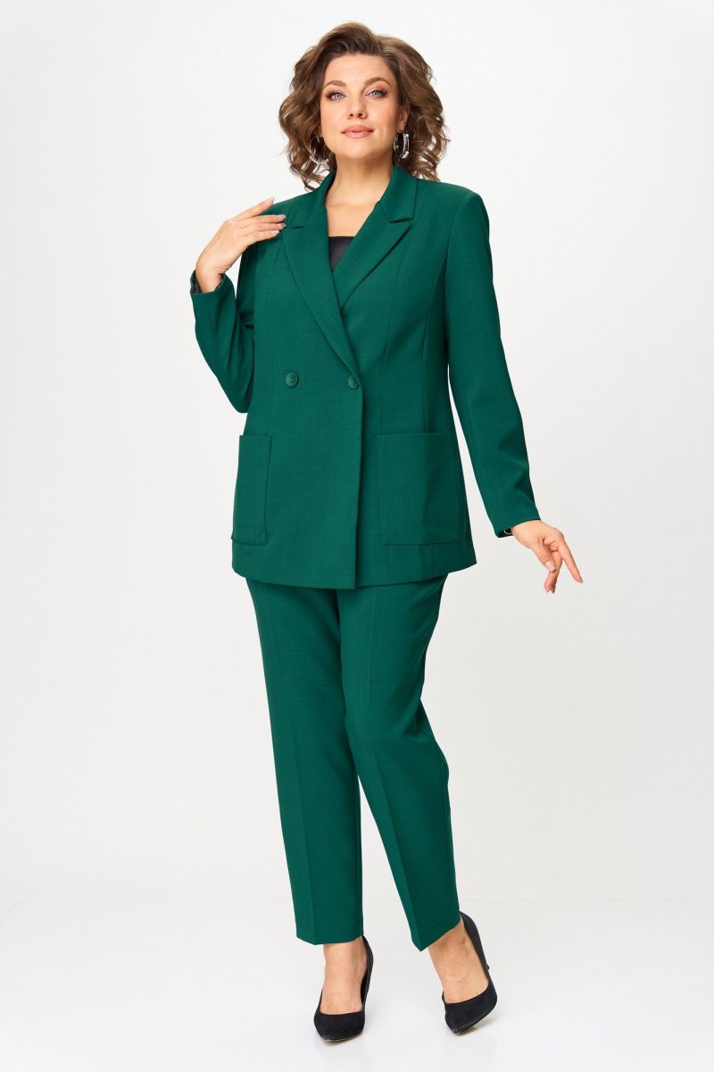 Костюм состоит из жакета и брюк. Костюм выполнен из однотонной ткани. Жакет прямого силуэта, НА ПОДКЛАДКЕ. Полочка жакета с вертикальными рельефами и двубортной застежкой на две пуговицы. Горловина V-образной формы. На нижней части полочки выполнены накладные карманы. Спинка со средним швом и отрезными бочками. Рукав длинный, втачной, двухшовный. Брюки со стрелками, зауженные к низу. По передним половинкам выполнены наклонные карманы и складки по талии. По задним половинкам обработаны талиевые вытачки. В среднем шве передней половинки брюк обработана застежка на молнию. Брюки на притачном поясе с эластичной тесьмой и застежкой на петлю и пуговицу.