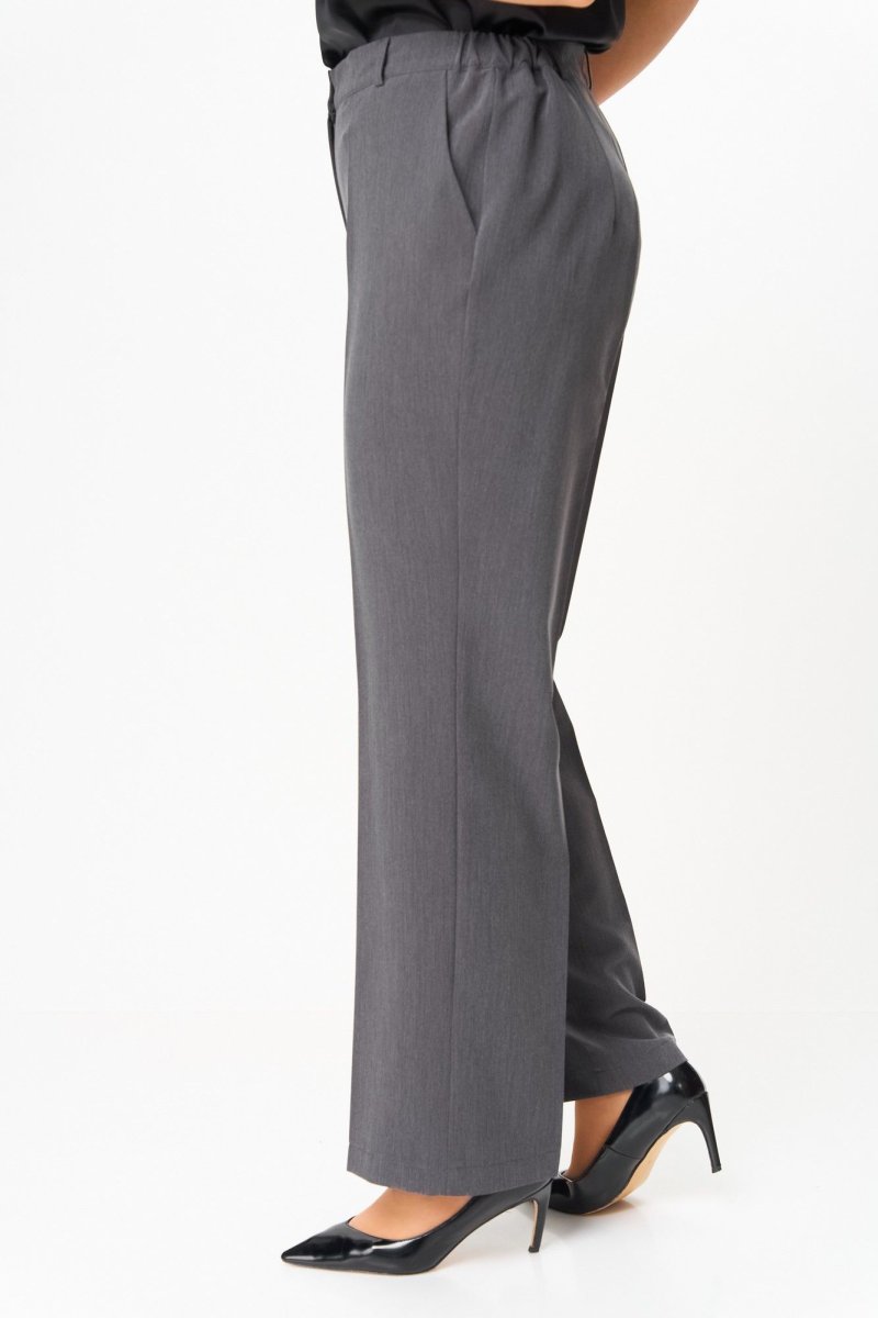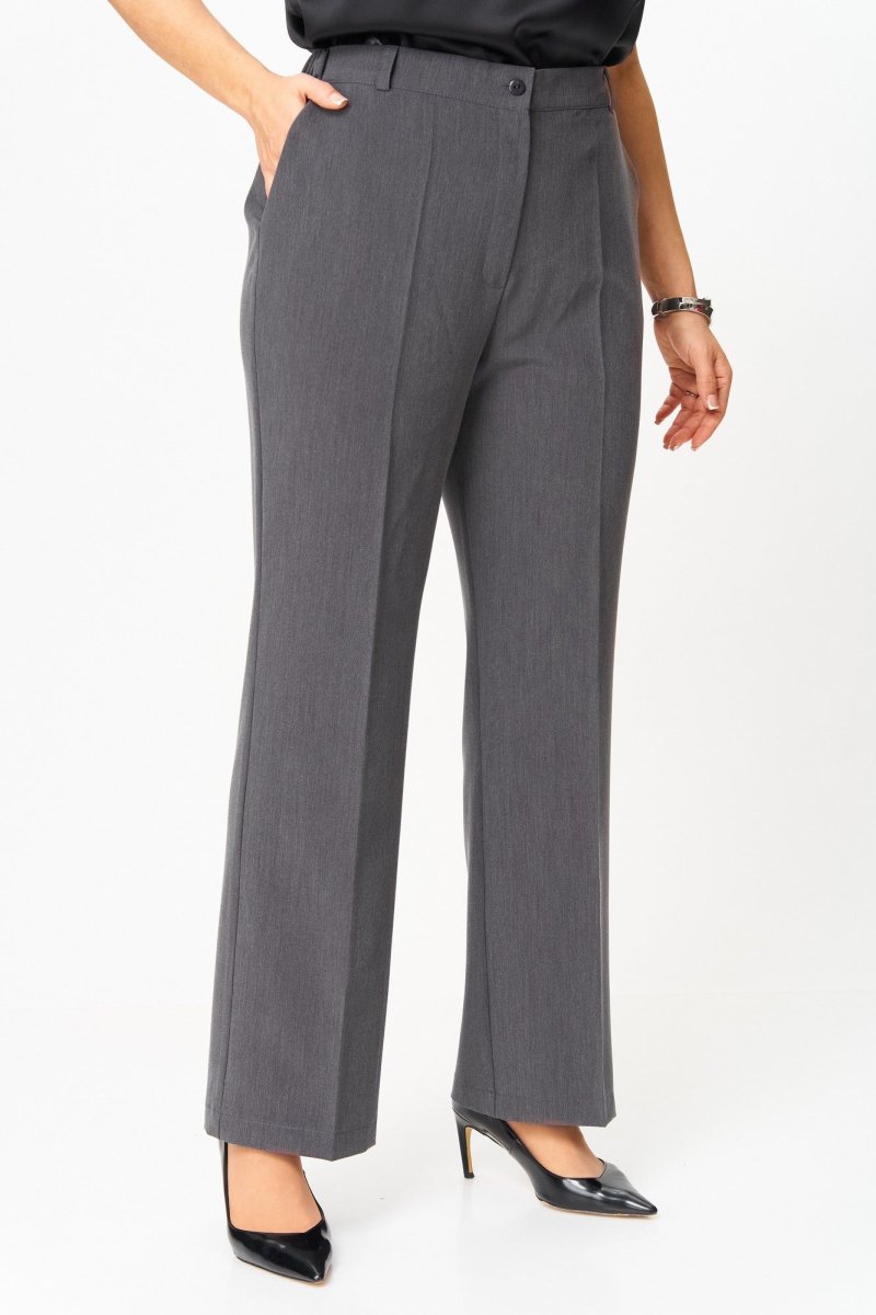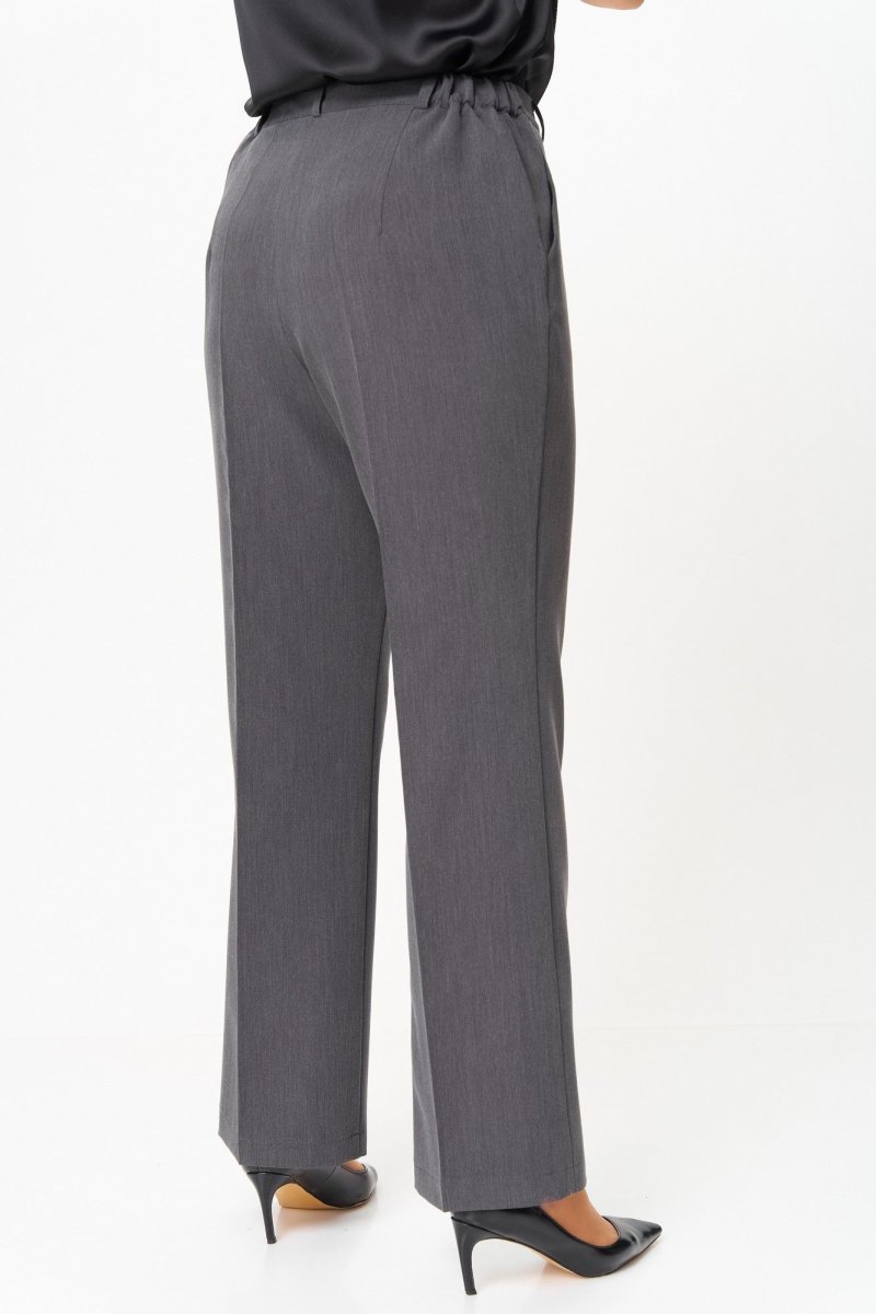 Брюки полной длины, прилегающие в области бедер и свободные в колене и по низу. Брюки со стрелками. По передним половинкам выполнены наклонные карманы. В левом боковом шве обработана застежка на потайную молнию. По талии брюки на притачном поясе с эластичной тесьмой и застежкой на петлю и пуговицу. По поясу брюк обработаны шлевки под ремень.