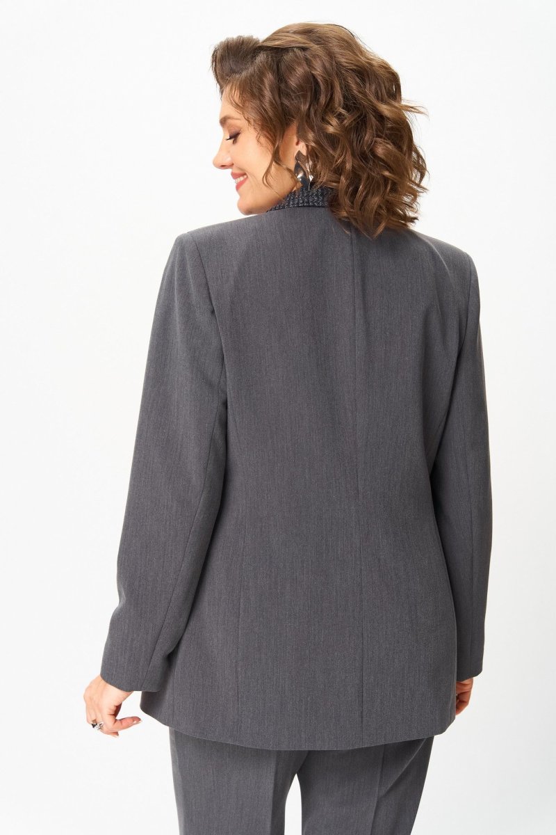 Полочка жакета с однобортной центральной застежкой на петли и пуговицы, вертикальными рельефами и прорезным карманом с клапаном. В верхней части полочки обработана фигурная кокетка из отделочной ткани. Горловина V-образной формы, с отложными лацканами и воротником пиджачного типа. Спинка со средним швом и вертикальными рельефами. Рукав длинный, двухшовный, втачной.