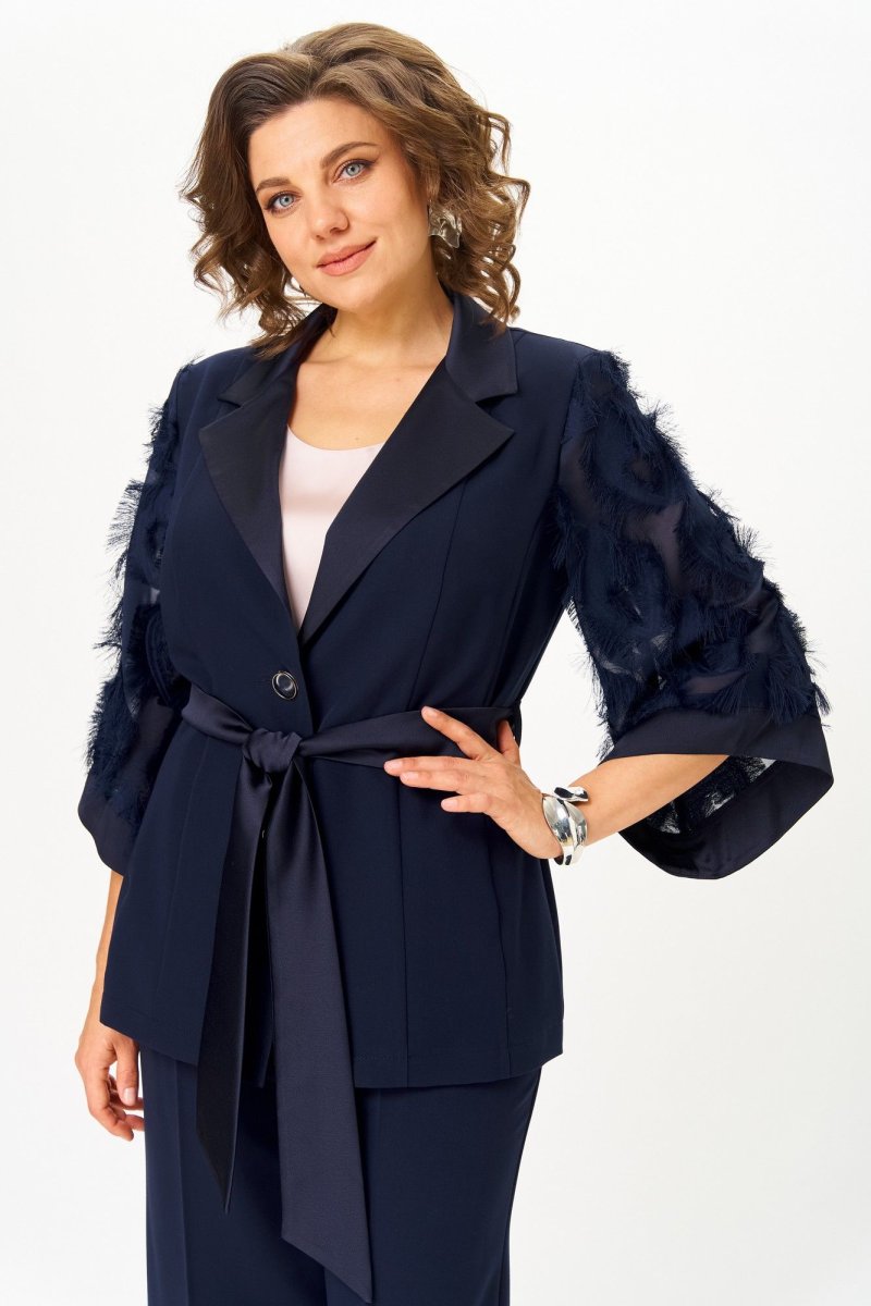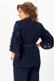 Полочка жакета с застежкой на две петли и пуговицы, с вертикальными рельефами и прорезными карманами. Горловина V-образной формы с отложными лацканами и воротником пиджачного типа. Спинка со средним швом. В области талии по боковым швам настрочены шлевки через которые продет пояс, завязывающийся спереди. Рукав одношовный, длиной 3/4, расширенный книзу. Низ рукава обработан притачной планкой.