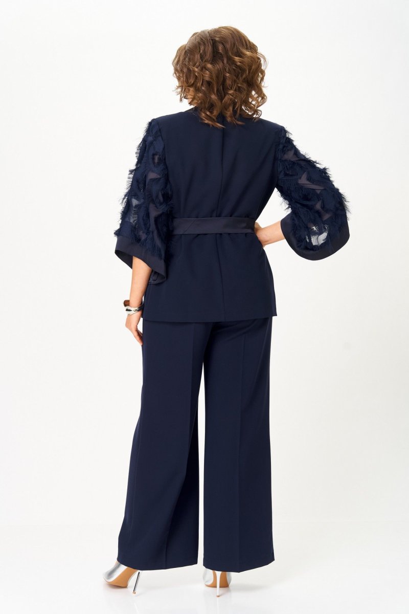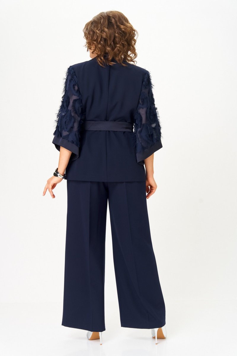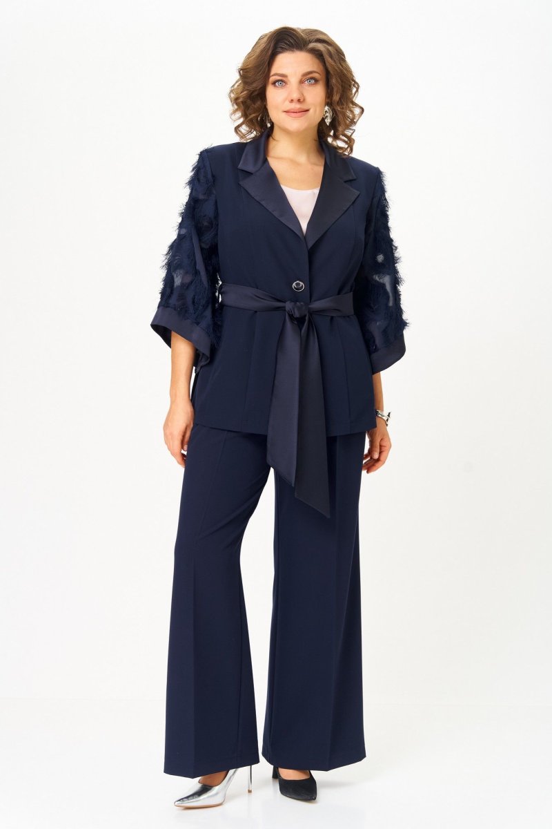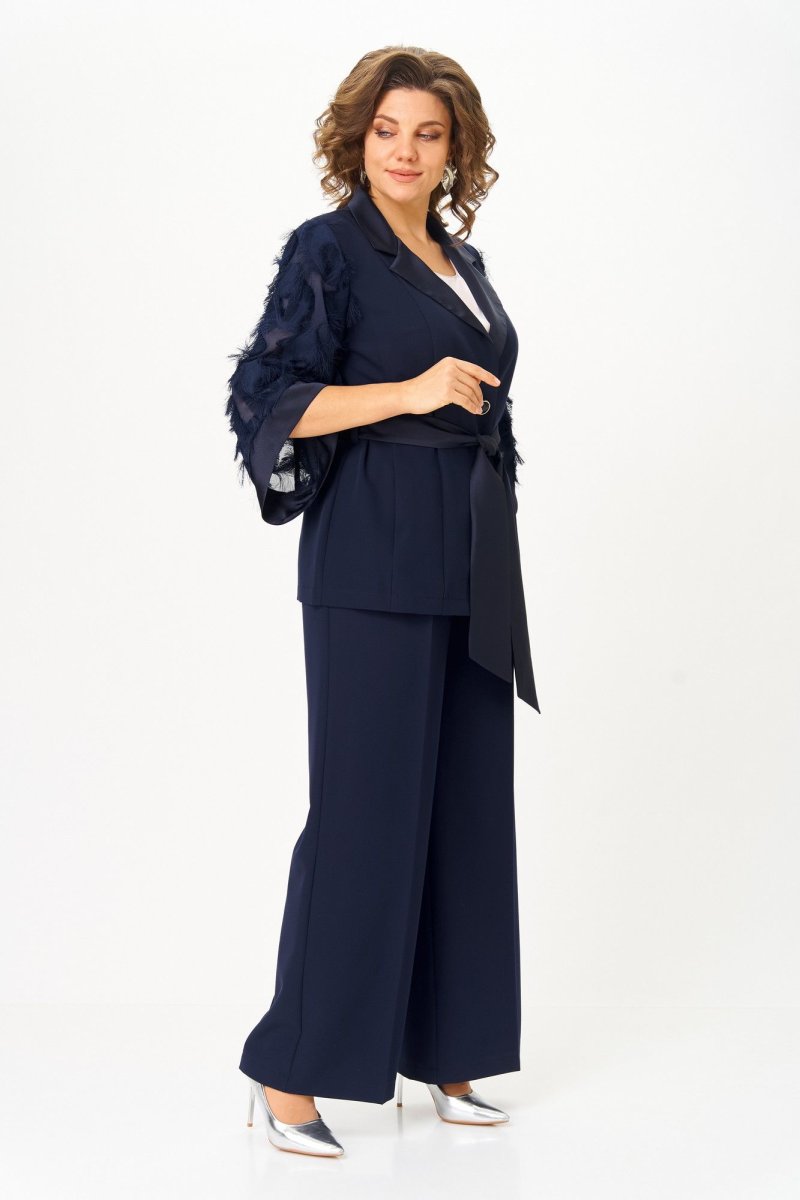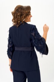 Костюм состоящий из жакета и брюк выполнен из однотонной ткани, в качестве отделки использован шифон с обьемным жаккардовым рисунком и однотонный атлас в цвет основной костюмной ткани.