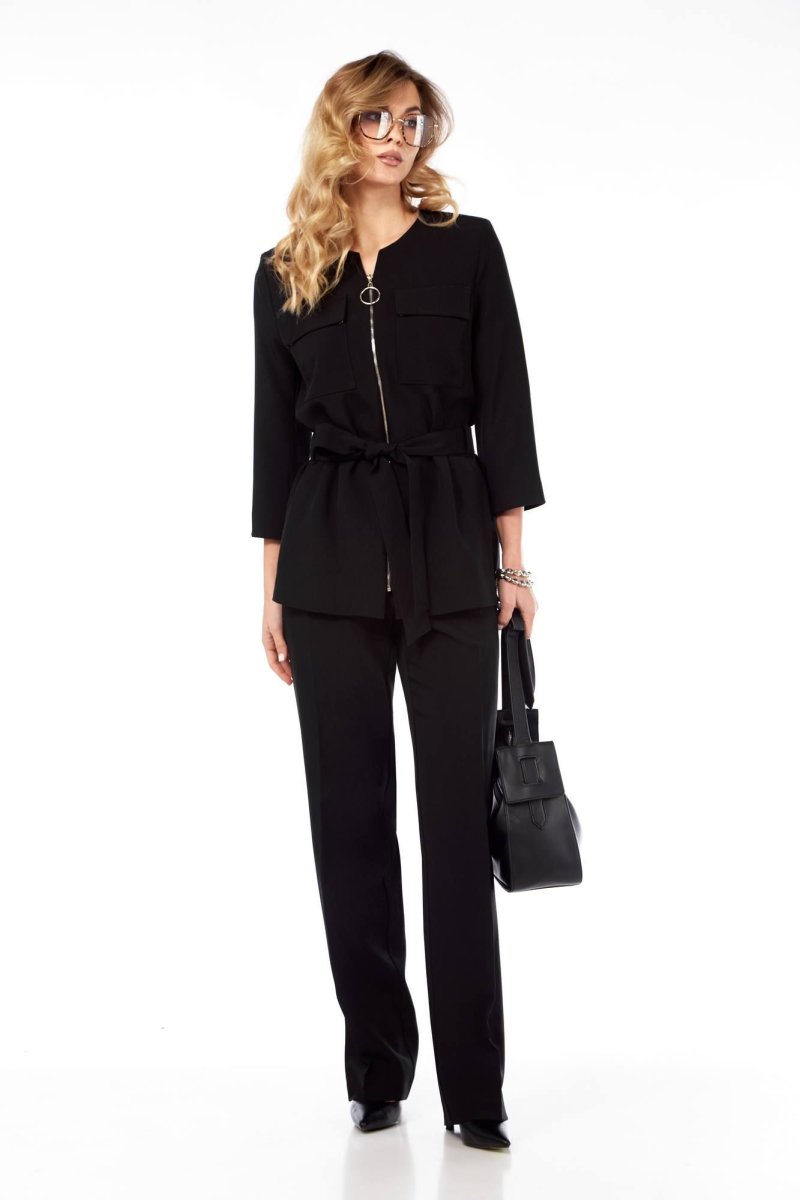 Комплект женский брючный, состоящий из жакета и брюк. Жакет прямого силуэта под пояс из той же ткани, без воротника, с полукруглой горловиной, с застёжкой спереди на молнию, рукав втачной 3/4 длины,по переду в верхней части накладные карманы с клапанами. Жакет на подкладке. Брюки прямые, свободные со стрелками, на поясе, по задней части пояса с эластичной тесьмой,с боковыми карманами.