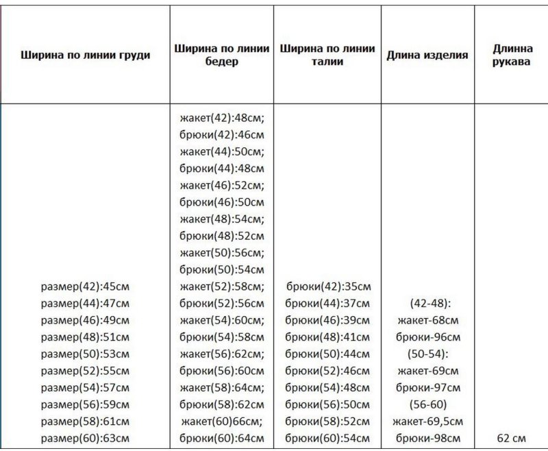 жакет(42):48см; брюки(42):46см жакет(44):50см; брюки(44):48см жакет(46):52см; брюки(46):50см жакет(48):54см; брюки(48):52см жакет(50):56см; брюки(50):54см жакет(52):58см; брюки(52):56см жакет(54):60см; брюки(54):58см жакет(56):62см; брюки(56):60см жакет(58):64см; брюки(58):62см жакет(60)66см; брюки(60):64см