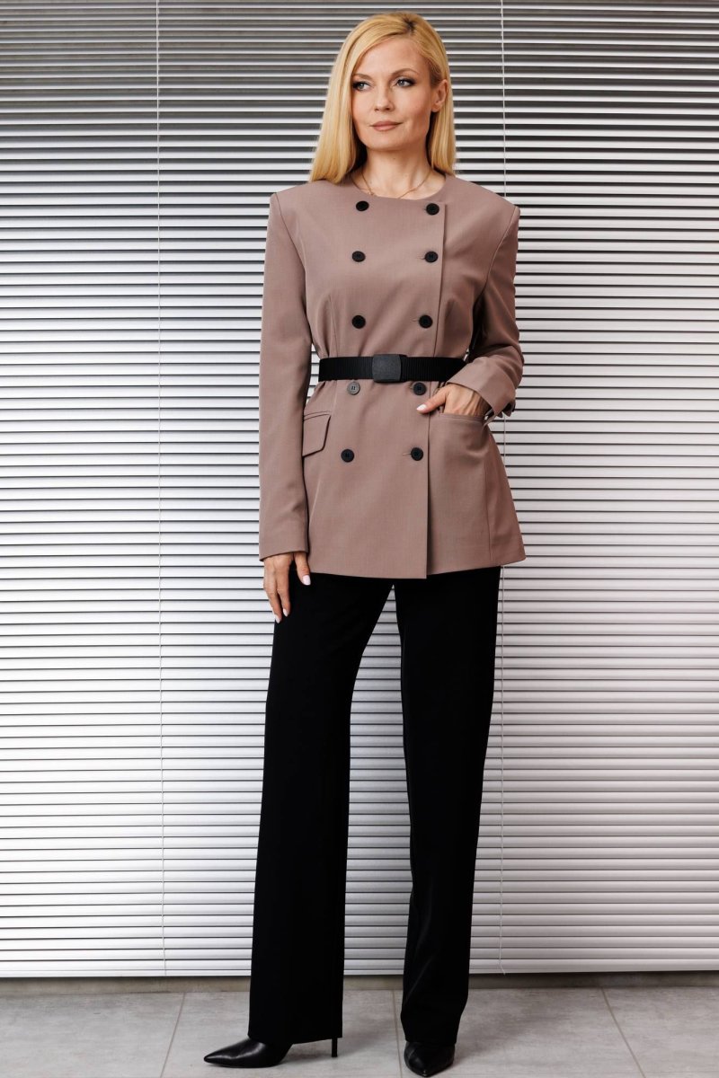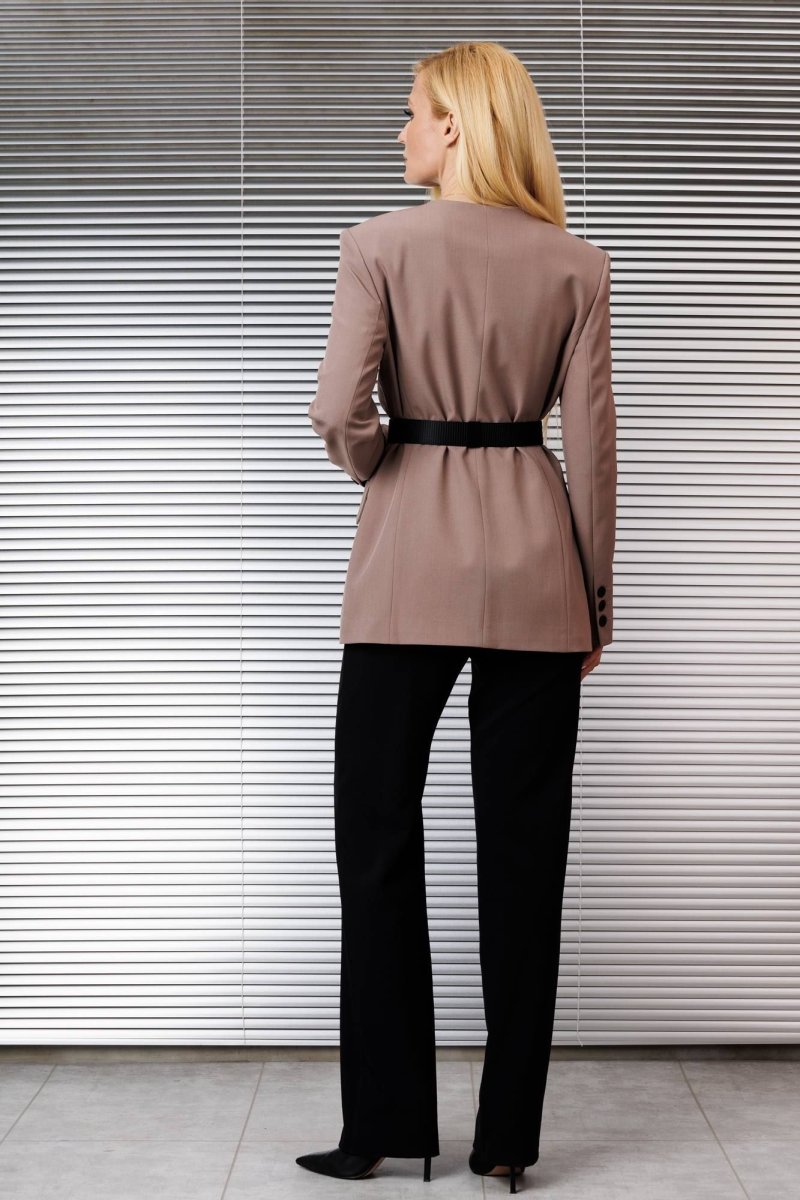 Комплект женский брючный, состоящий из жакета и брюк. Жакет на подкладке полуприлегающего силуэта, с втачным рукавом, без воротника,горловина полукруглая,застёжка спереди 2-бортная,по переду карманы с клапанами, под съёмный пояс. Брюки узкие, к низу свободные, длинные, на поясе-кокетке,с боковыми карманами,с застёжкой на молнию и пуговицы.