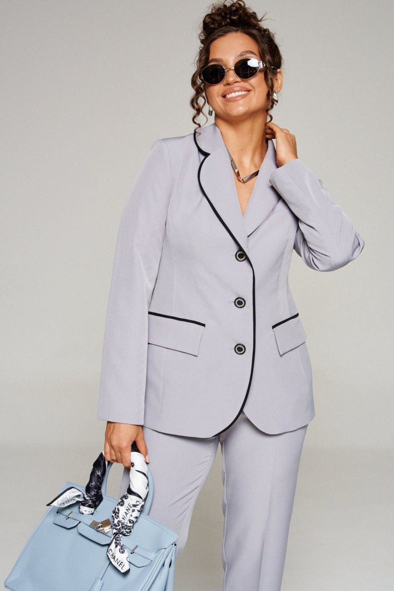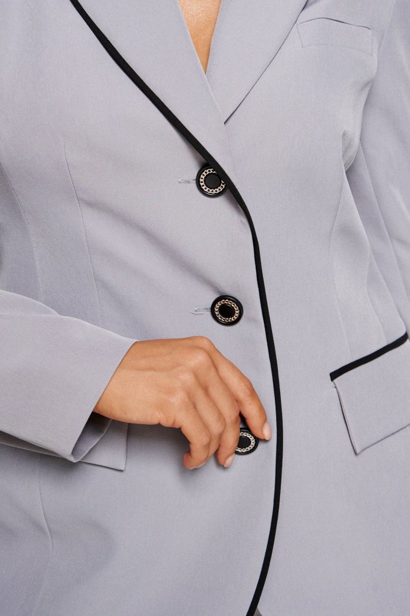 Жакет классический прилегающего силуэта длиной ниже бедер на подкладке, с асимметричными деталями и с декоративными элементами в виде контрастного канта.