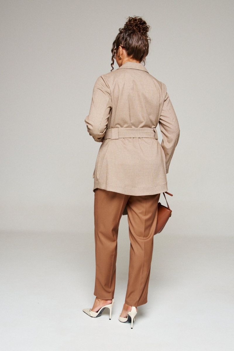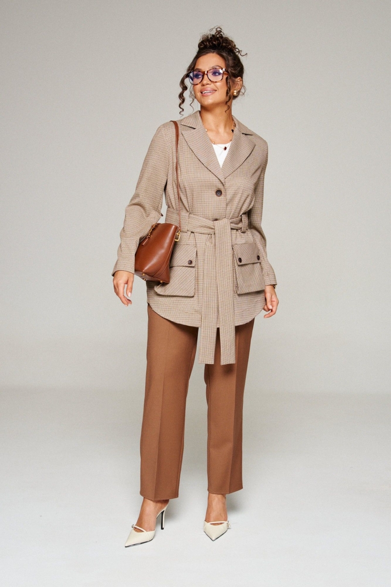 Передняя часть жакета цельнокроеная, с двумя нагрудными вытачками и двумя карманами-портфелями с клапанами в нижней части.