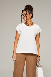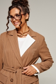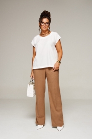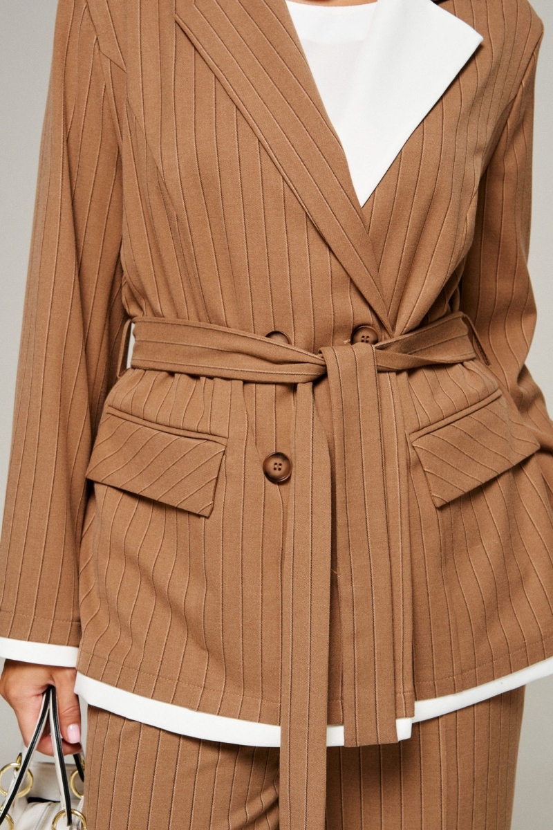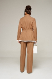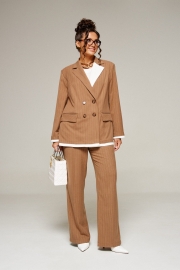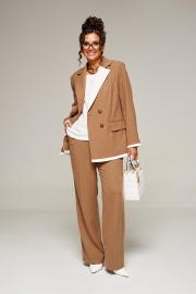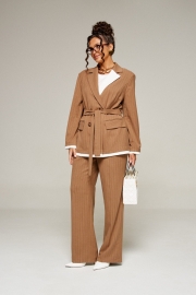 Деловой комплект 3-ка, состоящий из трех предметов: жакета, брюк и блузки. Блузка полуприлегающего силуэта. Горловина округлой формы. В боковых швах снизу разрезы. Перед цельный, с двумя нагрудными вытачками от бокового шва. Спинка разрезная по среднему шву с двумя вытачками на уровне талии. В верхней части среднего шва предусмотрен небольшой разрез с фиксацией на одну навесную петлю и пуговицу. Брюки классические прямые длинные. В верхней части брюк расположены функциональные карманы. Посадка стандартная высокая. Пояс притачной с резинкой по кругу. Жакет классический двубортный прямого силуэта длиной ниже бедер и с декоративными элементами в виде контрастных беек. К жакету прилагается пояс-завязка. Передняя часть с вертикальными рельефами от проймы и с прорезными боковыми карманами в рамку с клапаном. Спинка с центральным швом и с вертикальными рельефами от проймы. Рукав втачной двухшовный длинный. Воротник стояче-отложной с лацканами пиджачного типа. Низ борта прямой. Застёжка смещенная на две основные и одну потайную петли и пуговицы. Оригинальность модели придают контрастные левый лацкан и бейки по низу изделия и рукавам.
