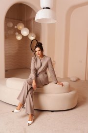 Состав: жакет, брюки – вискоза 61%; пэ 22%; пан 14%; эластан 3% блузка – пэ 68%; вискоза 27%; спандекс 5%