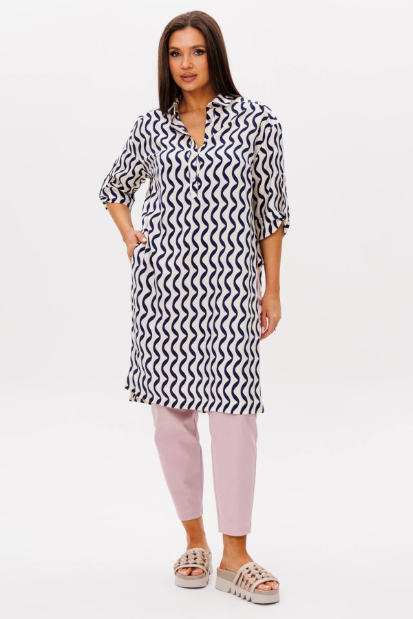 Костюм женский 2-х предметный. Вещи из комплекта легко сочетаются с другими предметами гардероба. Костюм мастерски скрывает недостатки фигуры, при этом вполне может соответствовать дресс-коду. Комплект состоит из удлинённой рубашки-туники и брюк. Туника выполнена из вискозного материала что делает её воздухопроницаемой, гигроскопичной. Застёжка по переду на длиной планке-«поло», воротник рубашечный на отрезной стойке. Боковые части длиной чуть ниже линии талии в сочетании с длинными спинками и передом делает модель оригинальной. Рукава выточены на спущенной линии плеча с отрезными манжетами. Длина ниже локтя с регулировкой на патах. Спинка с горизонтальной кокеткой и бантовой складкой. Брюки на широком приточном поясе с эластичной лентой по спинке, зауженные к линии низа. Имеют наклонные боковые карманы и имитацию кармана с листочкой на задней половинке. Длина блузки по спинке 99 см. Длина брюк 97 см