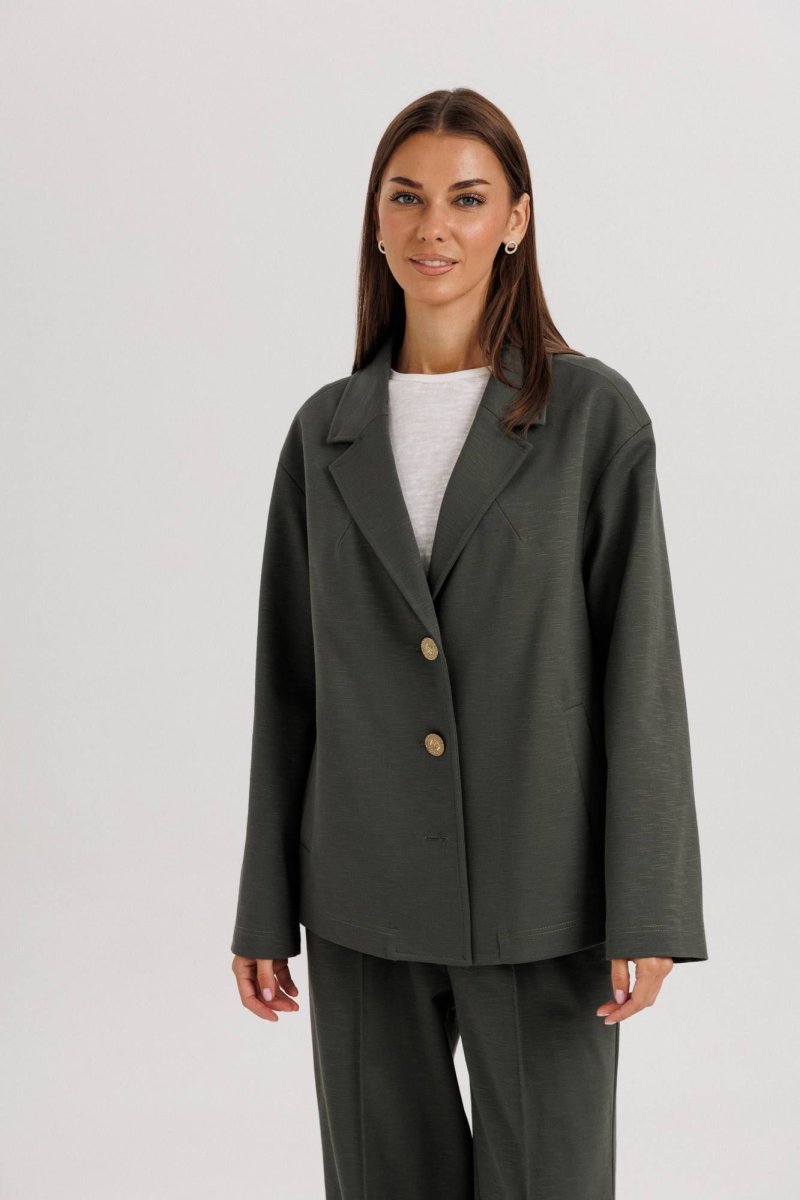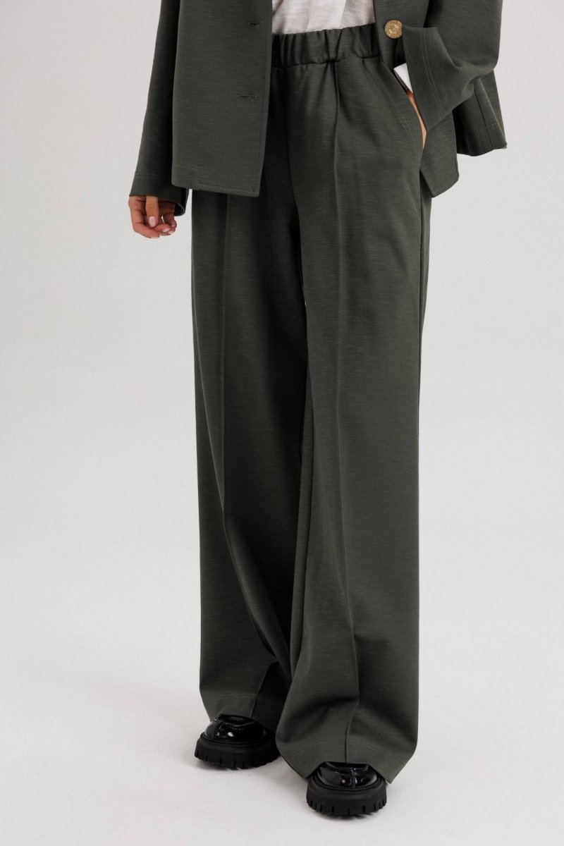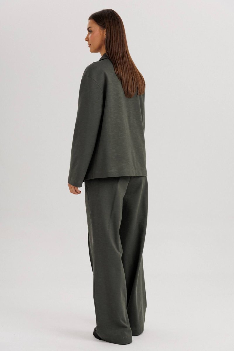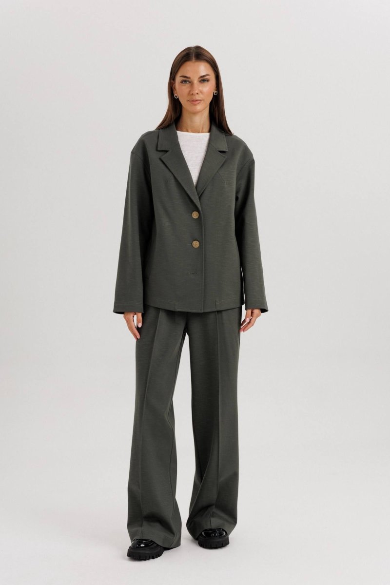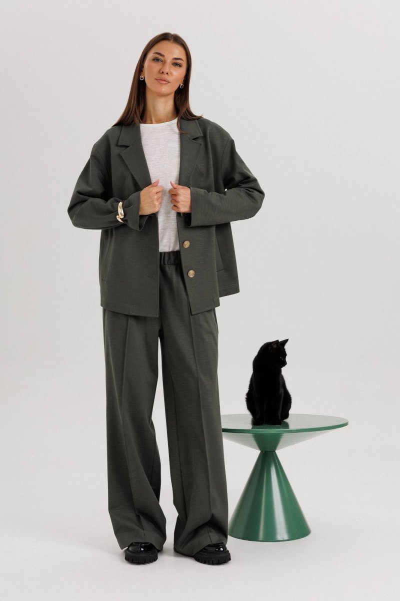Универсальный глубокий оттенок ткани делает костюм практичным и актуальным в любое время года.