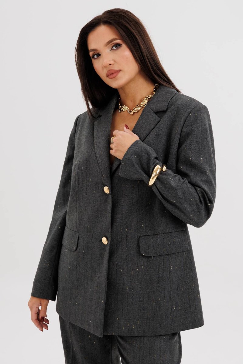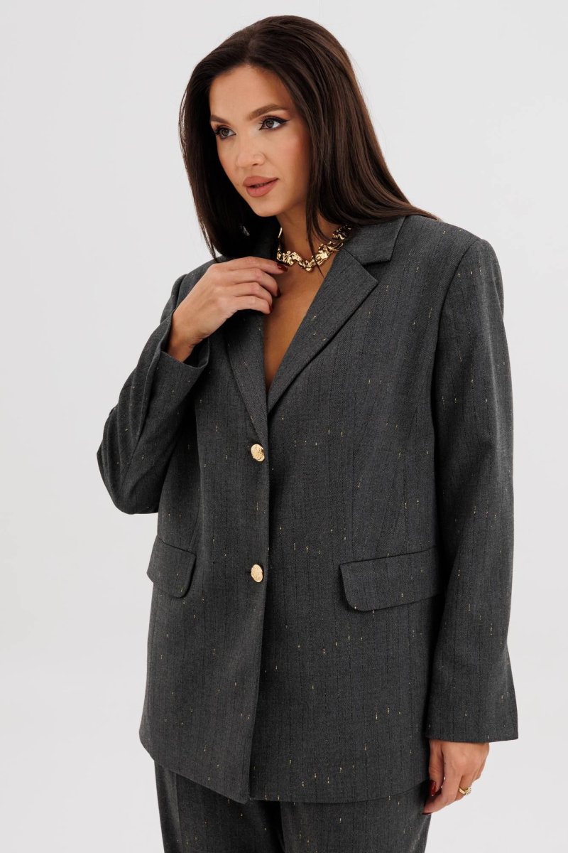 Жакет свободного расширенного силуэта, втачного покроя с центральной застёжкой и классическим английским воротником. Полочка с отрезным бочком, нагрудной вытачкой и прорезным карманом с клапаном. Спинка с центральным швом, шлицей и отрезным бочком. Рукав двухшовный с отлетной шлицей.
