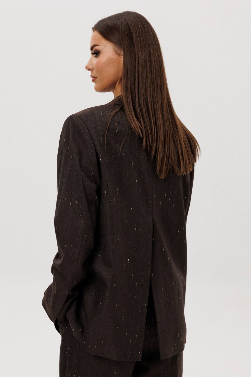 Жакет свободного расширенного силуэта, втачного покроя с центральной застёжкой и классическим английским воротником. Полочка с отрезным бочком, нагрудной вытачкой и прорезным карманом с клапаном. Спинка с центральным швом, шлицей и отрезным бочком. Рукав двухшовный с отлетной шлицей.