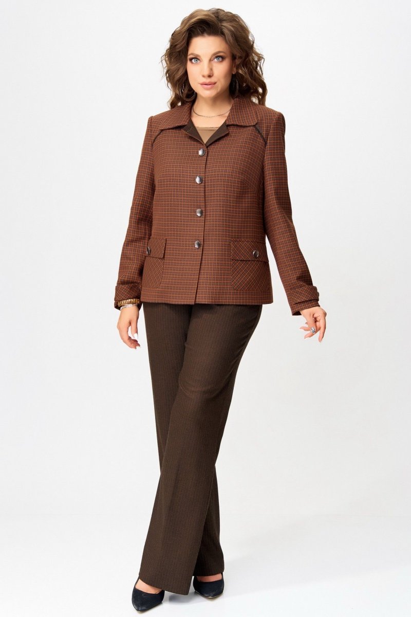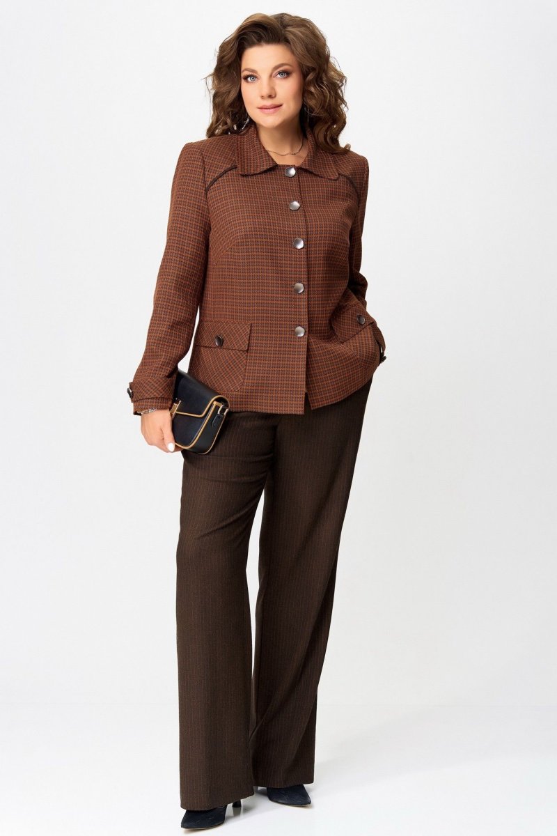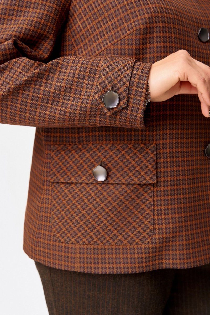 Жакет — как картина, написанная в клетку, где каждая линия — это штрих характера. Выполненный из текстильной ткани с подкладкой, он обнимает фигуру полуприлегающим силуэтом, подчеркивая осанку и уверенность. Однобортная застежка на петли и пуговицы — классическая, но с современным акцентом. Отложной воротник добавляет интеллигентности, а кокетка с декоративным кантом — изысканную графику, словно тонкая рамка на портрете. Нагрудная выточка и отрезной бочок формируют изящный рельеф, а накладные карманы с клапанами — функциональные и стильные, как детали винтажного чемодана. Спинка с кокеткой и средним швом — завершение композиции, где каждая строчка — как линия судьбы. Рукава — двухшовные, втачные, с декоративной патой на манжете — это штрих, который делает образ завершённым и продуманным.