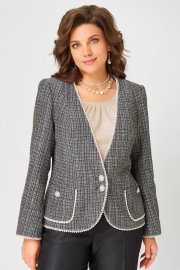 Жакет на подкладке полуприлегающего силуэта. Застежка в жакете однобортная на две пуговицы. По полочке рельефы, два накладных кармана, обрамленных декоративной тесьмой с застежкой на петлю и пуговицу. По спинке рельефы. По краю борта в жакете, по низу изделия и по низу рукавов настрочена декоративная тесьма.
