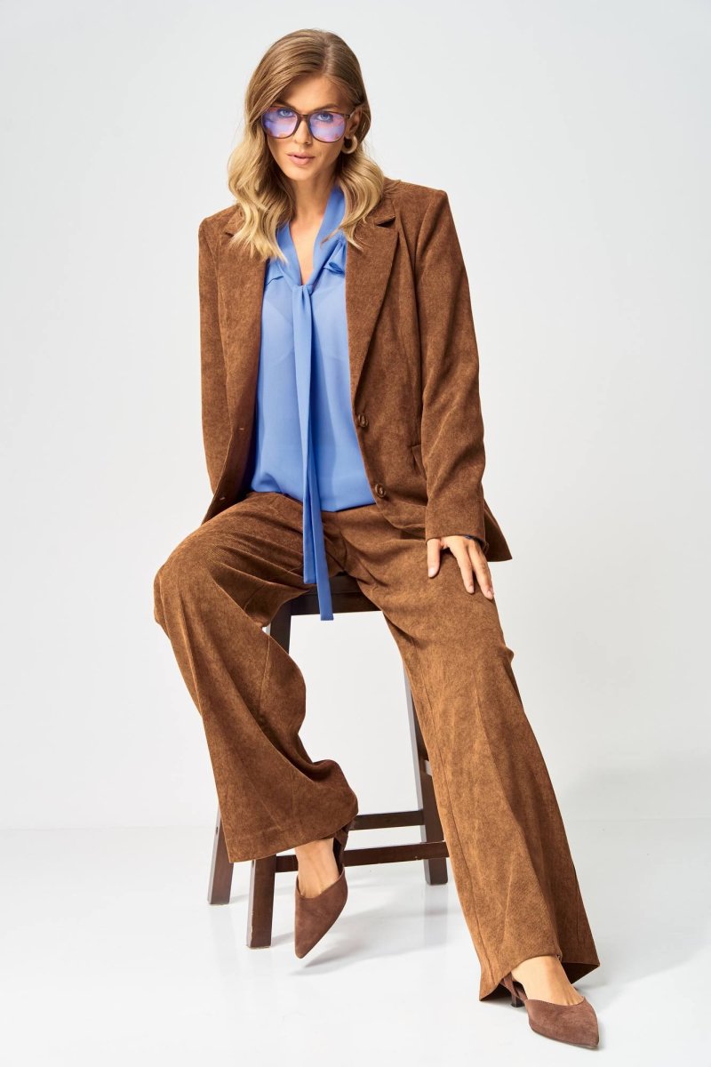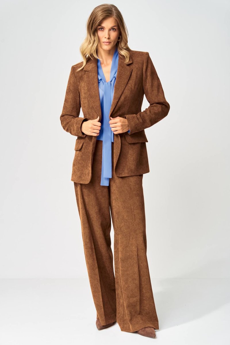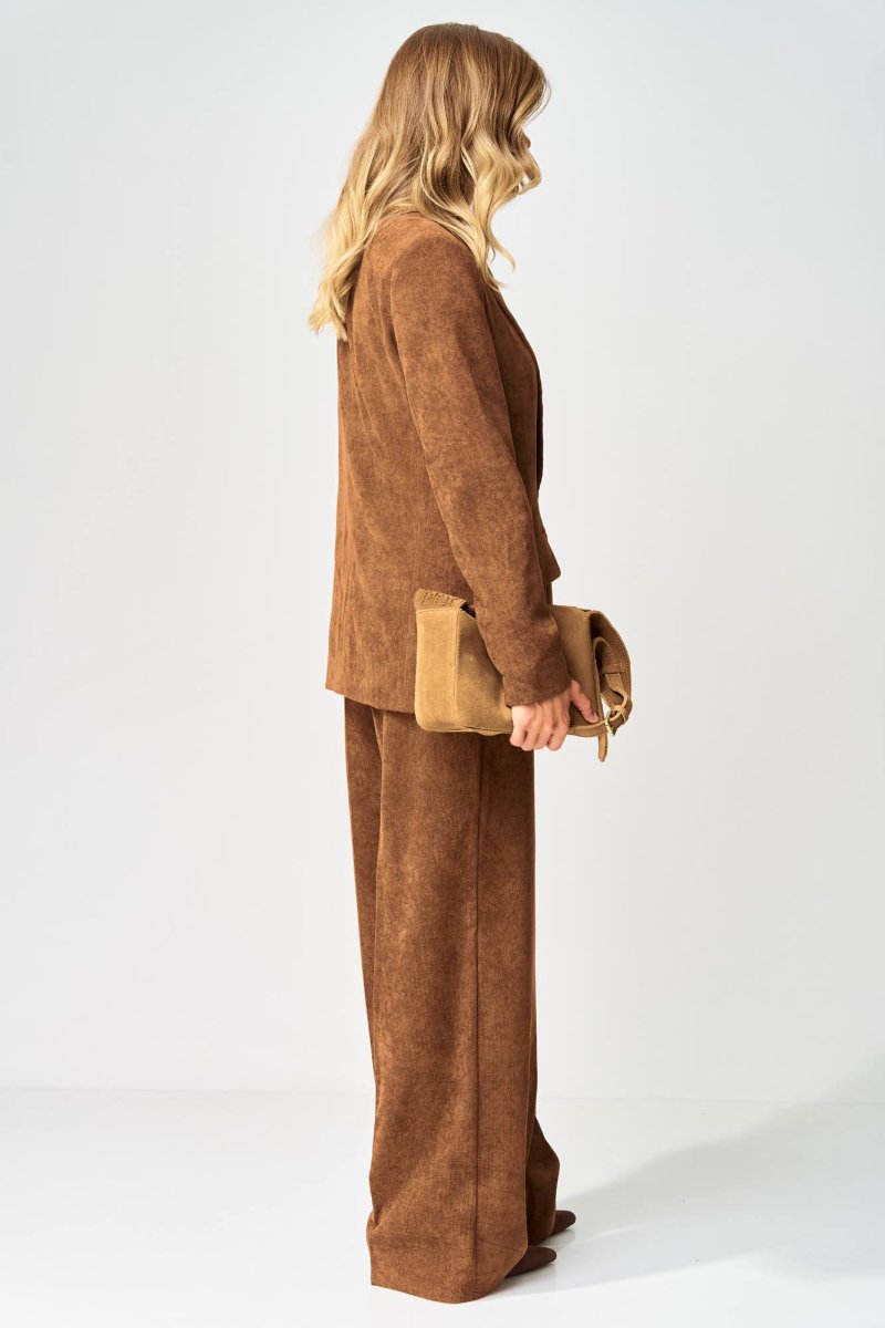 Костюм состоит из жакета и брюк. Жакет полуприлегающего силуэта из мягкой вельветовыой ткани приятного каштанового цвета. Застежка однобортная на две пуговицы, воротник пиджачного типа. Перед с талиевой вытачкой, рельефом и декоративным клапаном. Спинка с рельефами из проймы и средним швом. Рукав втачной двухшовный. Жакет на подкладке. Брюки палаццо с притачным поясом из мягкой вельветовой ткани. Спереди застежка гульфик на молнии и петлей и пуговицей по поясу. По задней частям брюк вытачки. Пояс с резинкой в боковых частях. Брюки с заутюженными стрелками. Длина жакета - 68 см, длина рукава жакета - 60 см. Длина брюк с учетом пояса - 109 см. Данная модель прекрасно сочетается с другой моделью из нашей коллекции 15410. Создайте гармоничный образ, комбинируя эти изделия!