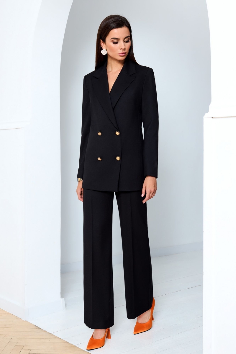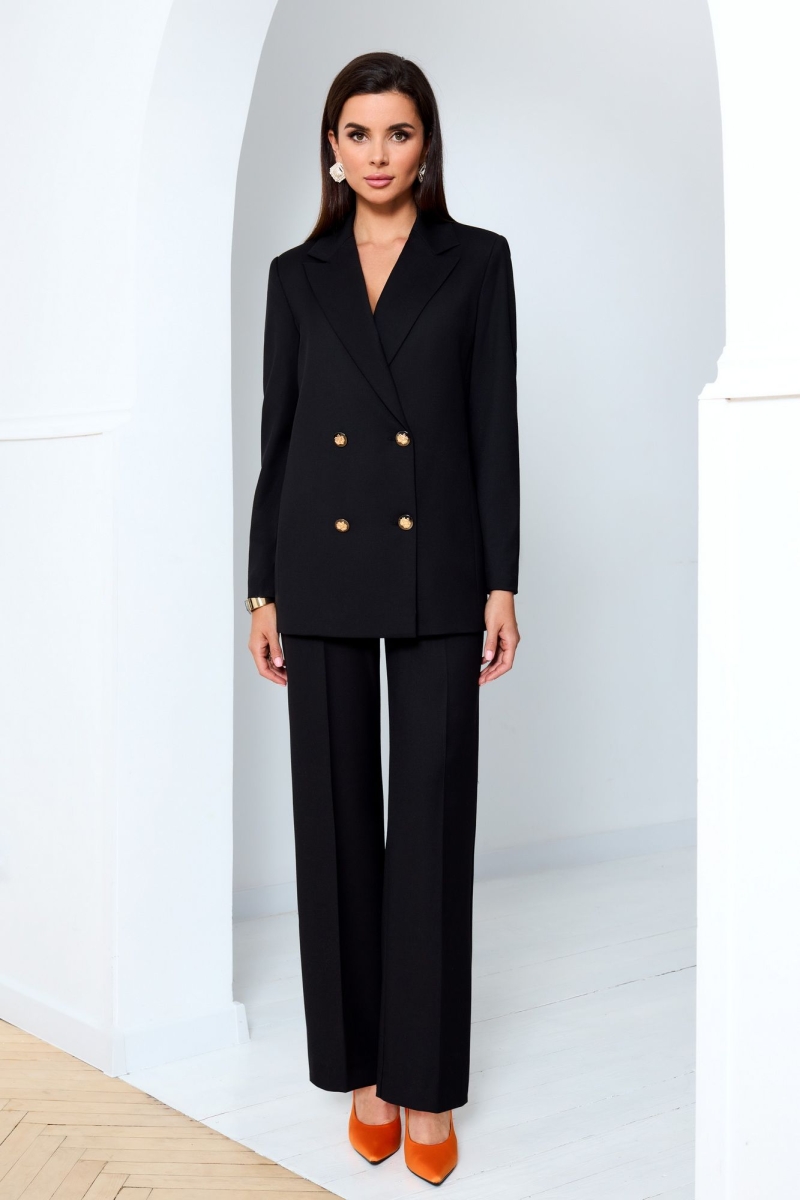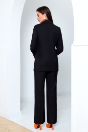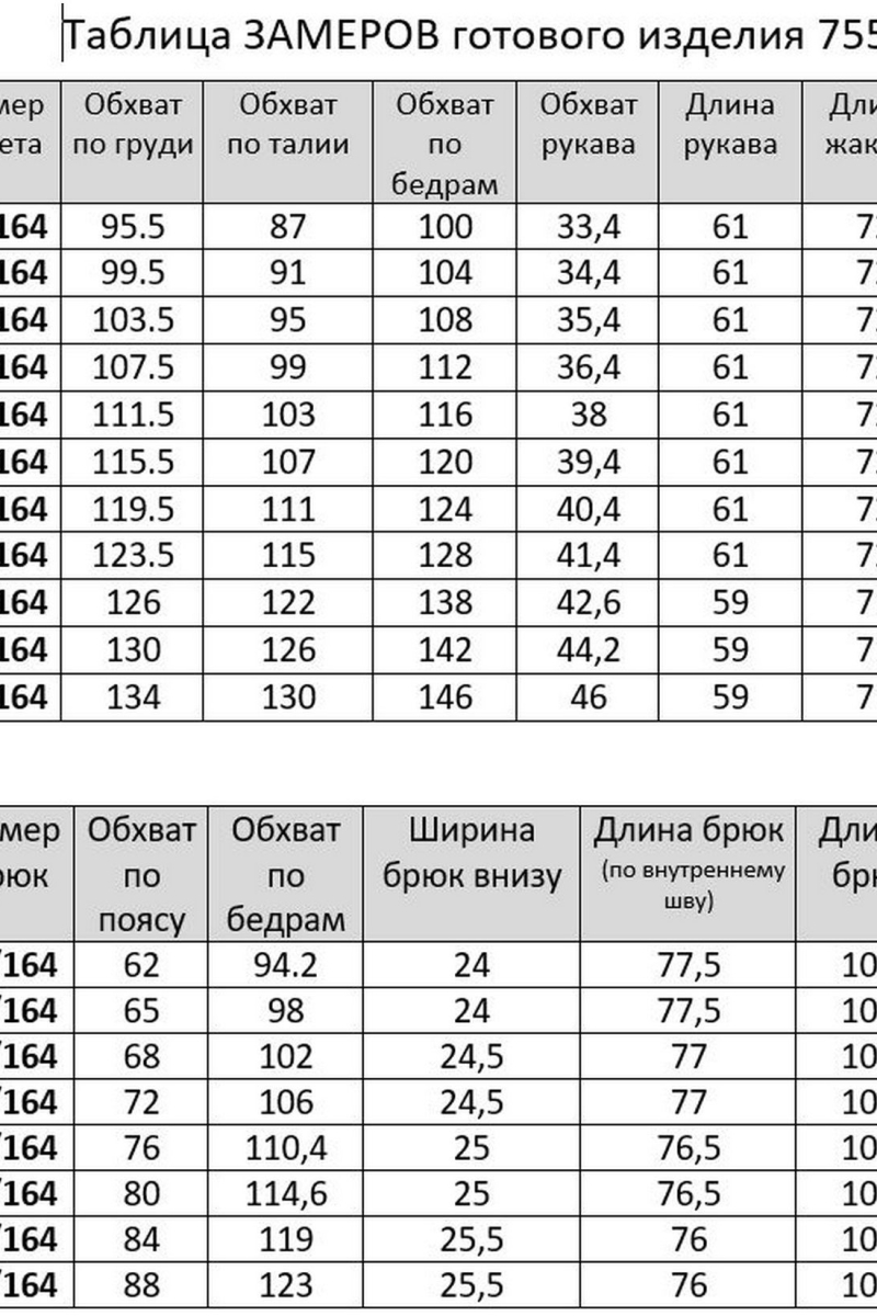 Комплект состоит из жакета и брюк. Жакет свободного силуэта, с двубортной с застежкой на четыре пуговицы. Полочки с отрезными бочками, с нагрудной вытачкой из горловины закрытой лацканом. Спинка со средним швом и двумя отрезными бочками. Рукав двухшовный втачной. Жакет на подкладке. Брюки прямые к низу. Верх брюк на поясе со шлевками. Застежка гульфик на молнии. Фурнитура может быть изменена. Длина жакета 72 см, рукава - 60 см, брюк - 101см. Длина платья:99см