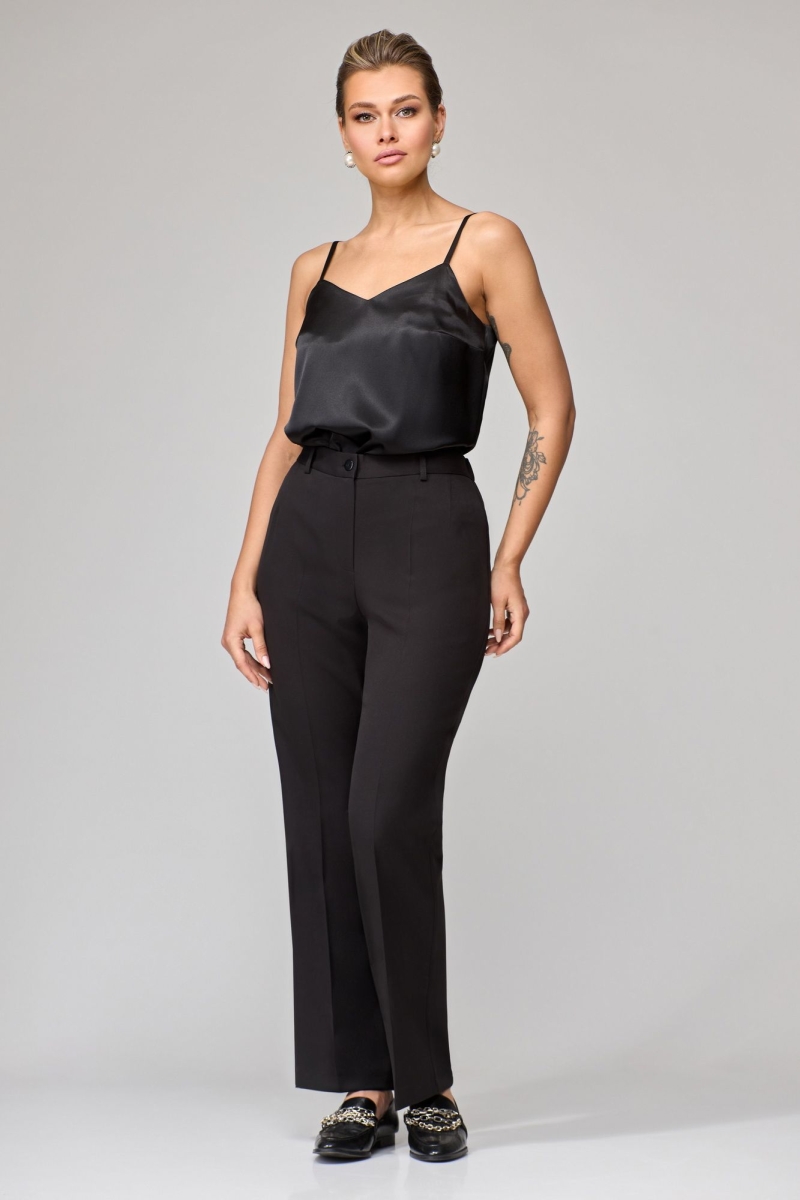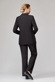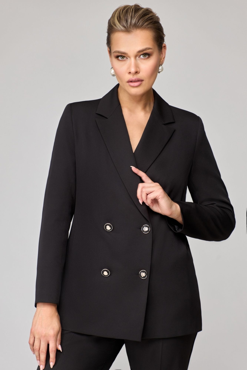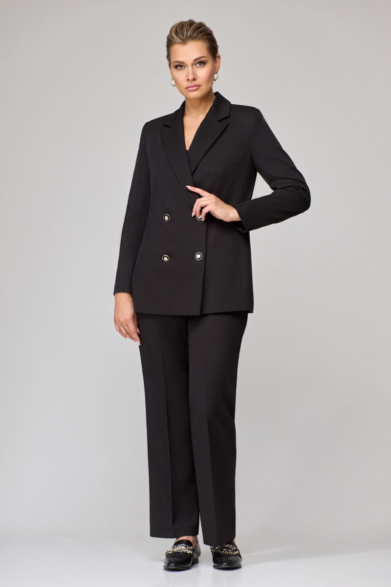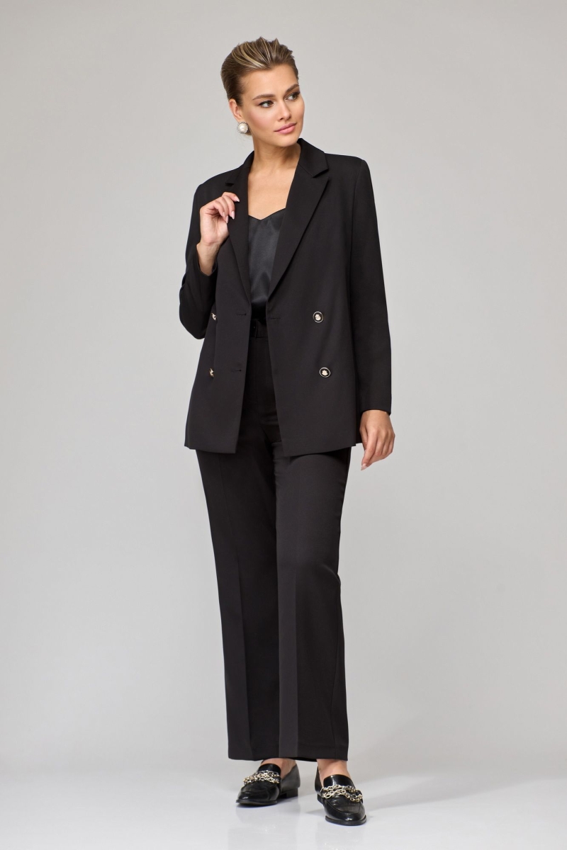 Комплект состоит из жакета и брюк. Жакет свободного силуэта, с двубортной с застежкой на четыре пуговицы. Полочки с отрезными бочками, с нагрудной вытачкой из горловины закрытой лацканом. Спинка со средним швом и двумя отрезными бочками. Рукав двухшовный втачной. Жакет на подкладке. Брюки прямые к низу. Верх брюк на поясе со шлевками. Застежка гульфик на молнии. Фурнитура может быть изменена. Длина жакета 72 см, рукава - 60 см, брюк - 101см. Длина платья:99см
