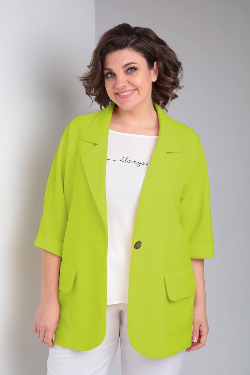 Жакет прямого силуэта, однобортный, застежка центральная на одну пуговицу. Борт с фигурным лацканом, воротник пиджачный. По переду накладные карманы с клапаном. Рукав реглан, длиной 3/4. Спинка прямая. Жакет без подкладки.