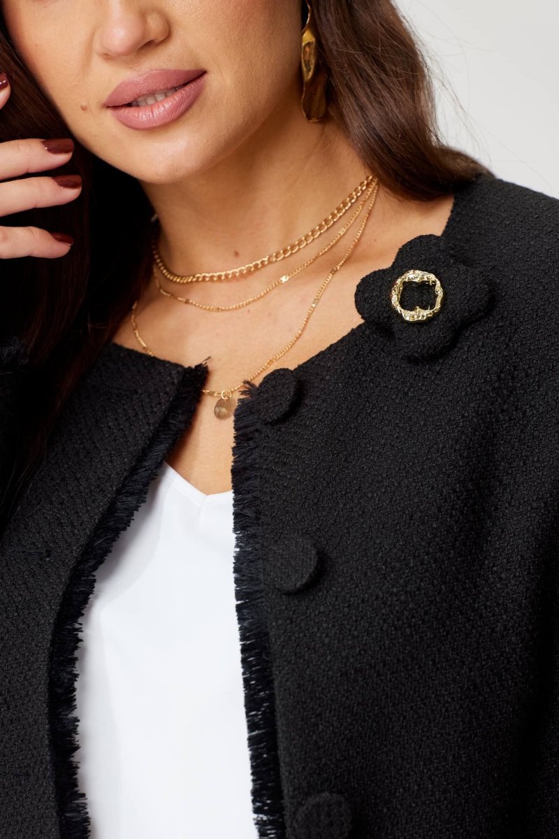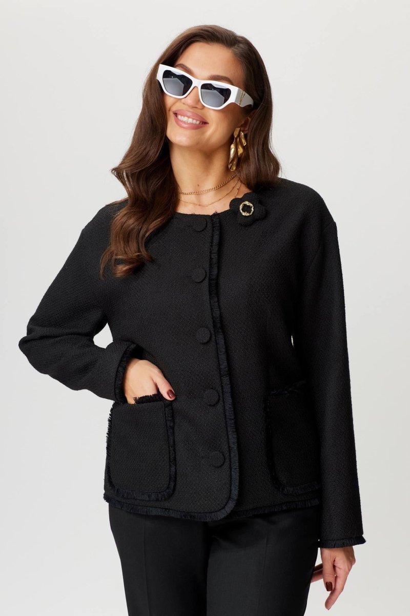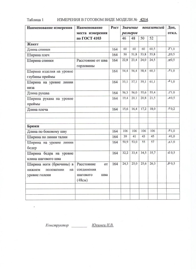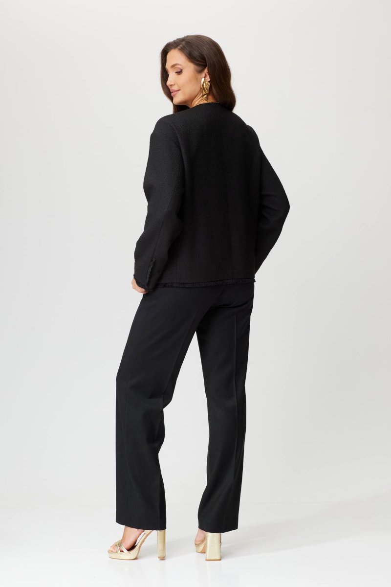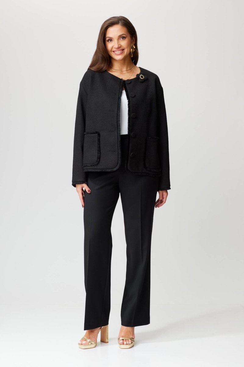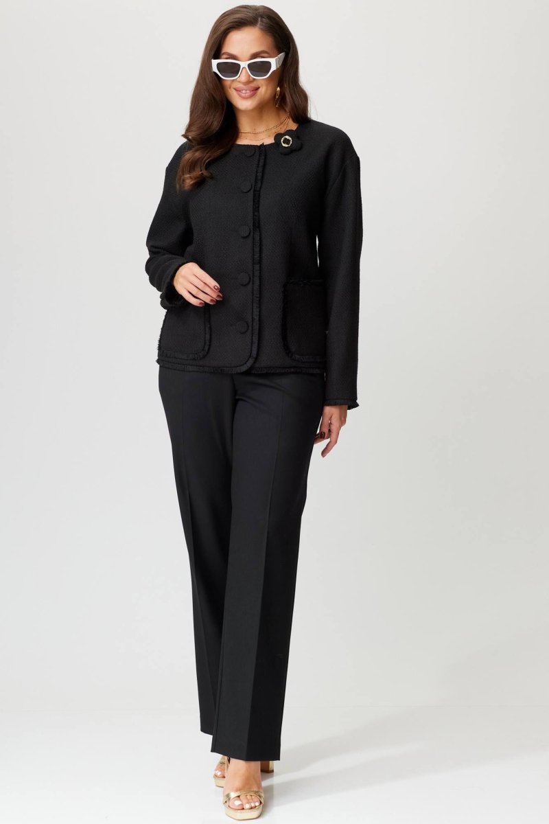 Комплект женский (жакет и брюки). Жакет женский, свободного силуэта, на подкладке, длиной ниже линии бедер, с втачными рукавами, с центральной сквозной застежкой на 5 петель и 5 пуговиц. Детали переда жакета с талиевыми вытачками, с накладными карманами, карманы оформлены декоративной тесьмой. Деталь спинки жакета с рельефными швами. Рукава втачные двухшовные, с передним и локтевым швами. Вырез горловины жакета округлой формы «под горло». Жакет с притачной понизу подкладкой. Край борта, низ жакета, низ рукавов и частично по локтевым швам оформлены декоративной тесьмой. Брюки на бедрах, плотно облегающие вверху и прямые к низу, с притачным поясом, по спинке в пояс вставлена эластичная тесьма. Застежка на тесьму-молнию и 1 потайной крючок. В боковых швах обработаны наклонные карманы. На задних половинках брюк обработаны по 1 вытачке. На передних и задних половинках брюк заутюжены «канты». Декор может отличаться от представленного на фотографии.