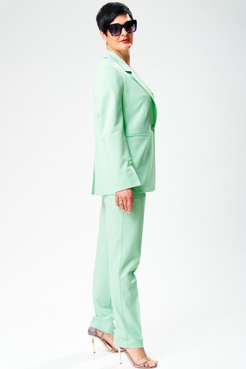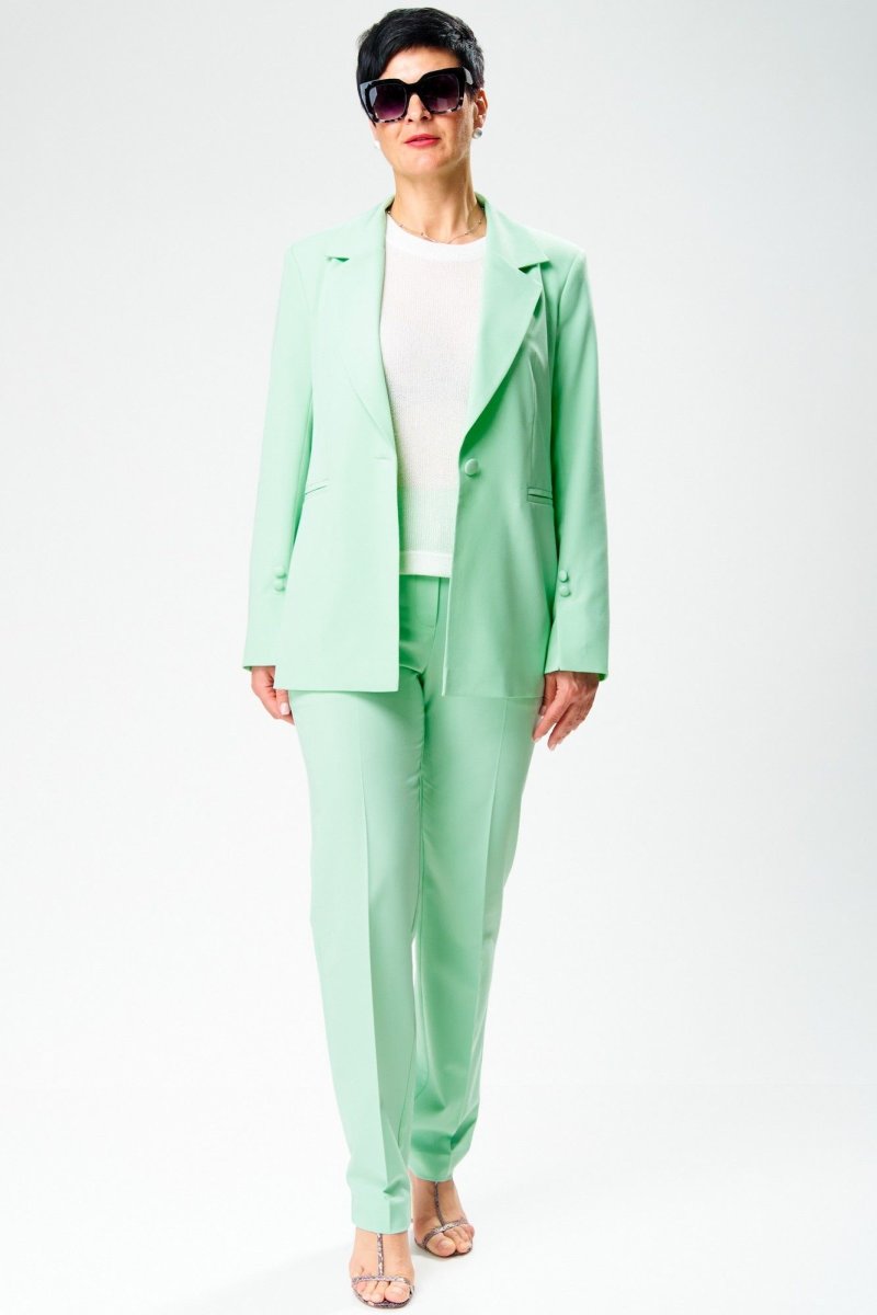 Комплект из костюмной ткани нежных, весенних оттенков.Жакет женский, свободного силуэта, на подкладке, длиной ниже линии бедер, с втачными рукавами, с центральной сквозной застежкой на 1петлю и 1 пуговицу до линии перегиба лацкана. Детали переда жакета с отрезными бочками, горизонтально расположенными боковыми прорезными карманами с листочками, и талиевыми вытачками от разрезов карманов. Деталь спинки жакета с рельефными швами и со средним швом, который заканчивается шлицей. Рукава втачные двухшовные, с передним и локтевым швами, внизу передних швов обработана шлица и декоративно прикреплены по 2 пуговицы над закрепкой. Воротник отложной пиджачного типа. Углы воротника и лацканов острые. Края воротника, лацкана, борта, клапанов обработаны в чистый край. Жакет с притачной понизу подкладкой.