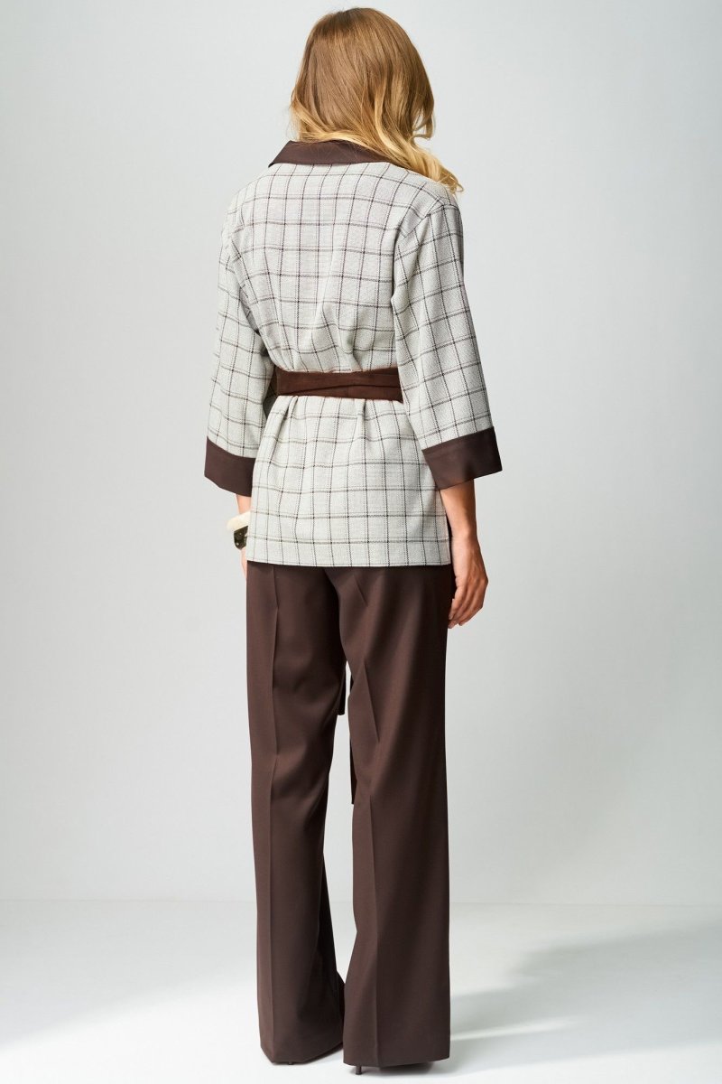 Жакет полуприлегающего силуэта, длиной до линии бедер. Воротник втачной. Перед с нагрудными вытачками и с втачными планками по горловине. Спинка цельная, в боковых швах разрезы. Рукава втачные одношовные длиной 7/8 с притачными манжетами, линия плеча спущена. Съемный пояс в комплекте.