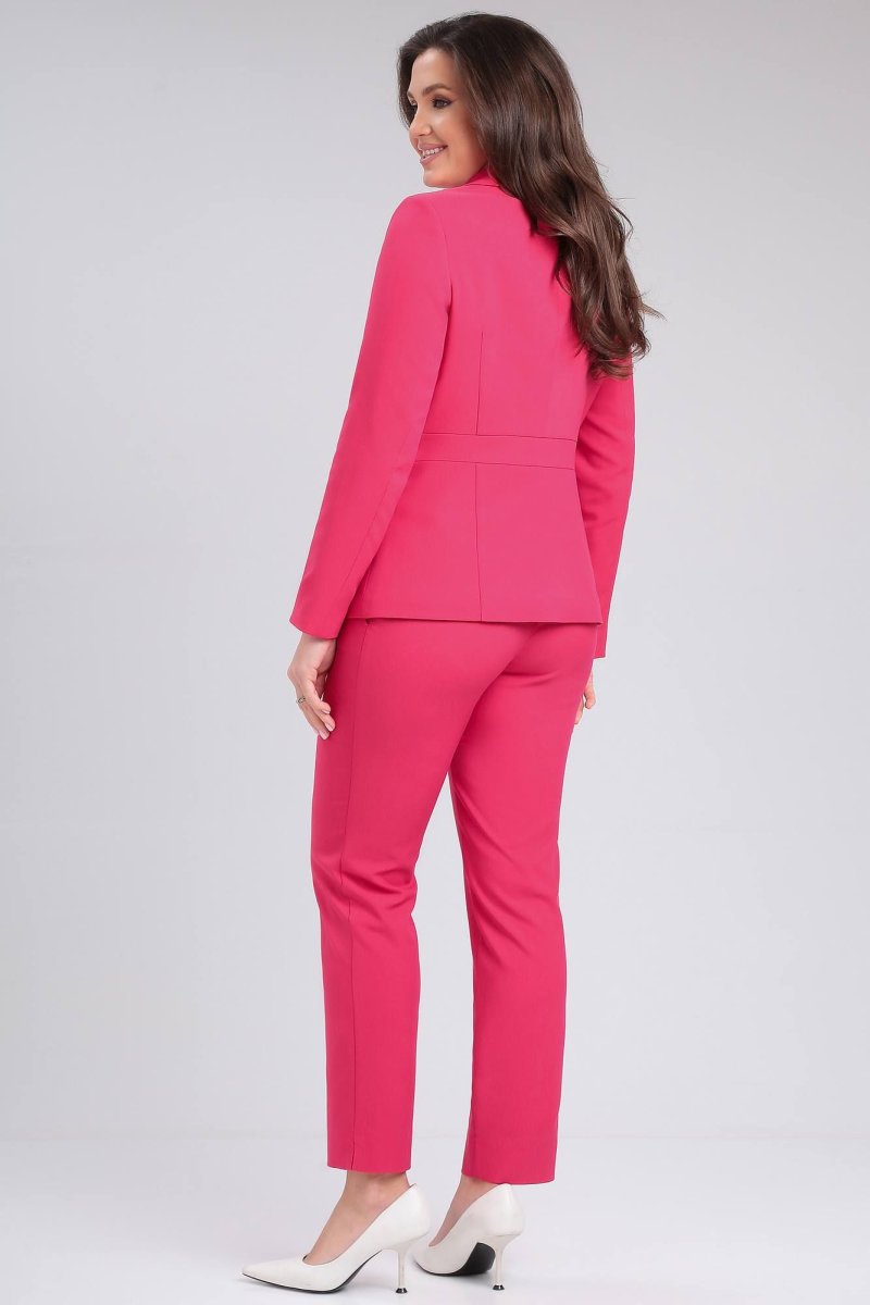 Комплект женский, состоящий из жакета и брюк. Жакет на фирменной подкладке, приталенного силуэта. По переду и спинке втачной пояс по талии и талиевые вытачки. Спинка со средним швом до пояса. Рукав втачной, двухшовный, длинный. Воротник - пиджачного типа, застежка центральная, двубортная на 2 петли и пуговицы. Брюки заужены к низу, с функциональными карманами по переду. На притачном поясе со шлевками. Застежка на тесьму-молнию и обтяжную пуговицу. По низу боковых швов небольшие разрезы.