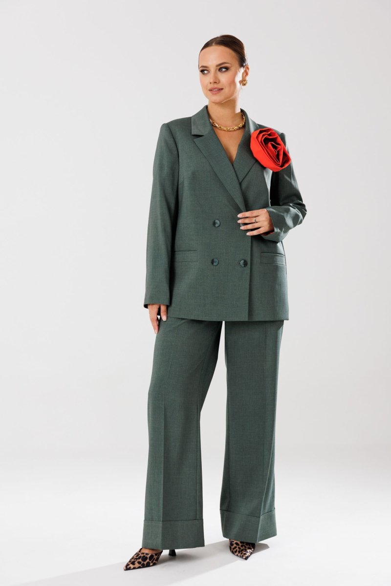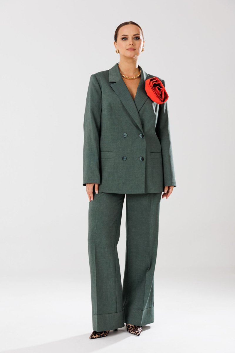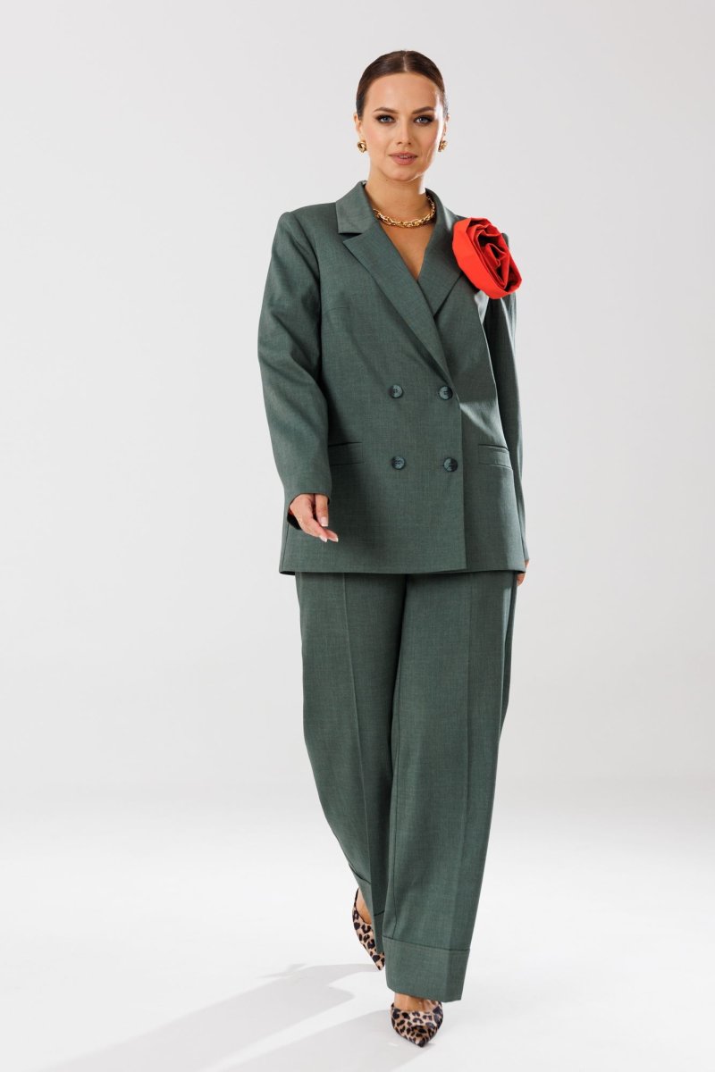 Жакет прямого кроя на подкладке. По переду нагрудные вытачки, функциональные карманы с листочкой, центральная двубортная застежка на петли-пуговицы. Горловина оформлена воротником пиджачного типа с лацканом. Спинка со средним швом, шлицей-планкой из отделочной ткани, застегивающейся на петли-пуговицы. Рукава втачные, двухшовные. Жакет декорирван съемным цветком из отделочной ткани.
