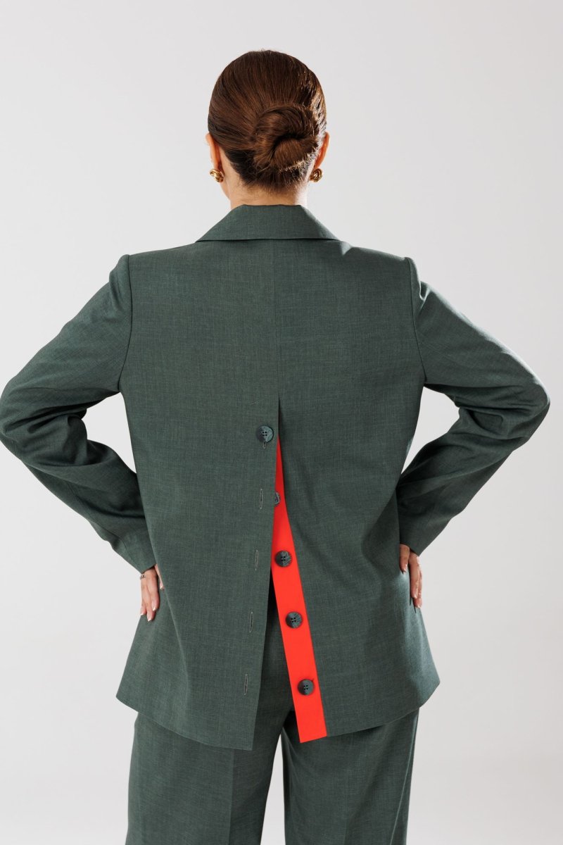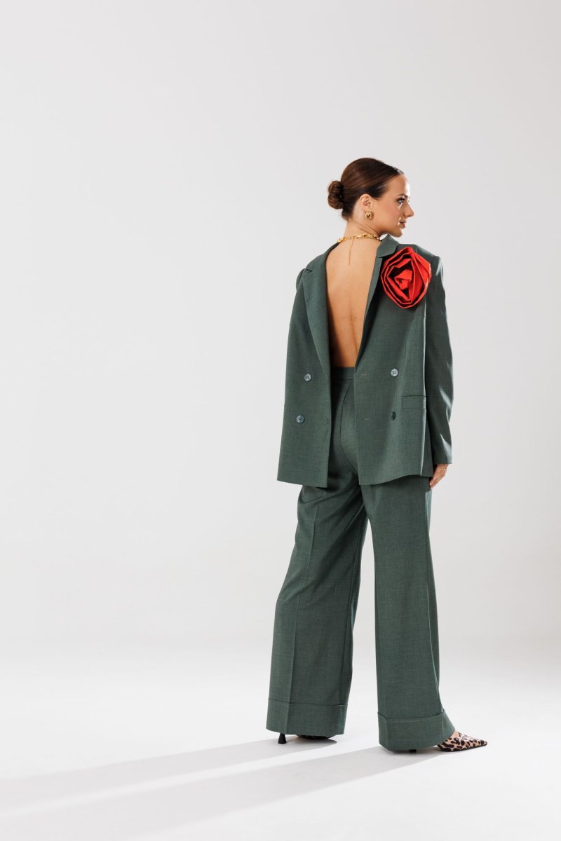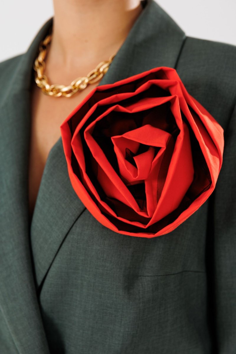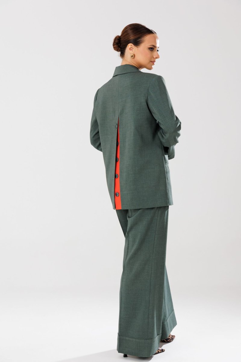 Жакет прямого кроя на подкладке. По переду нагрудные вытачки, функциональные карманы с листочкой, центральная двубортная застежка на петли-пуговицы. Горловина оформлена воротником пиджачного типа с лацканом. Спинка со средним швом, шлицей-планкой из отделочной ткани, застегивающейся на петли-пуговицы. Рукава втачные, двухшовные. Жакет декорирван съемным цветком из отделочной ткани.