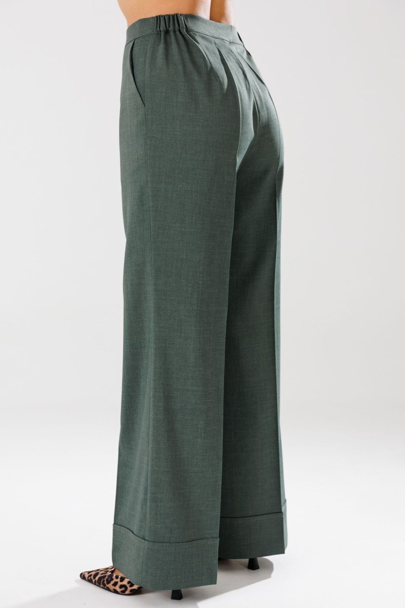 Брюки прямого, свободного кроя с высокой посадкой, с наклонными карманами в боковых швах, по срезу банта – застежка-молния. По передним половинкам талиевые вытачки. По низу брюк отрезные манжеты.