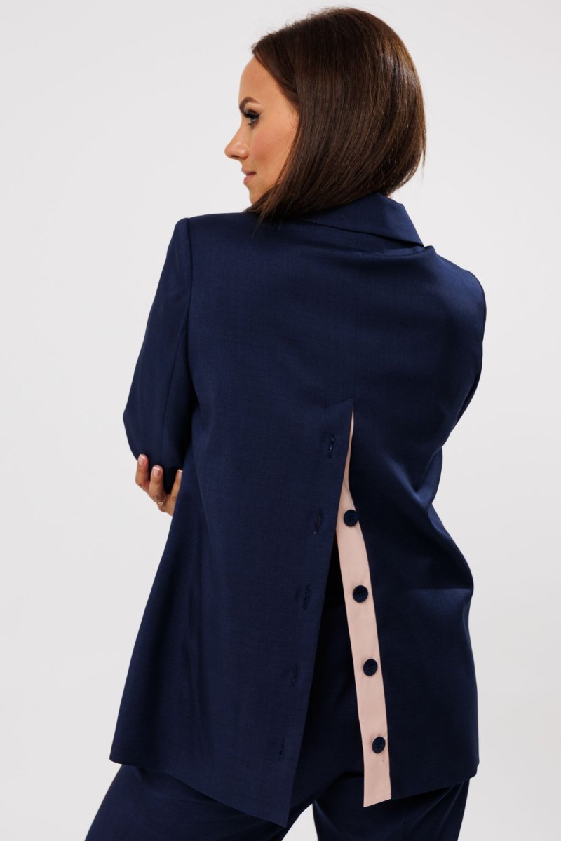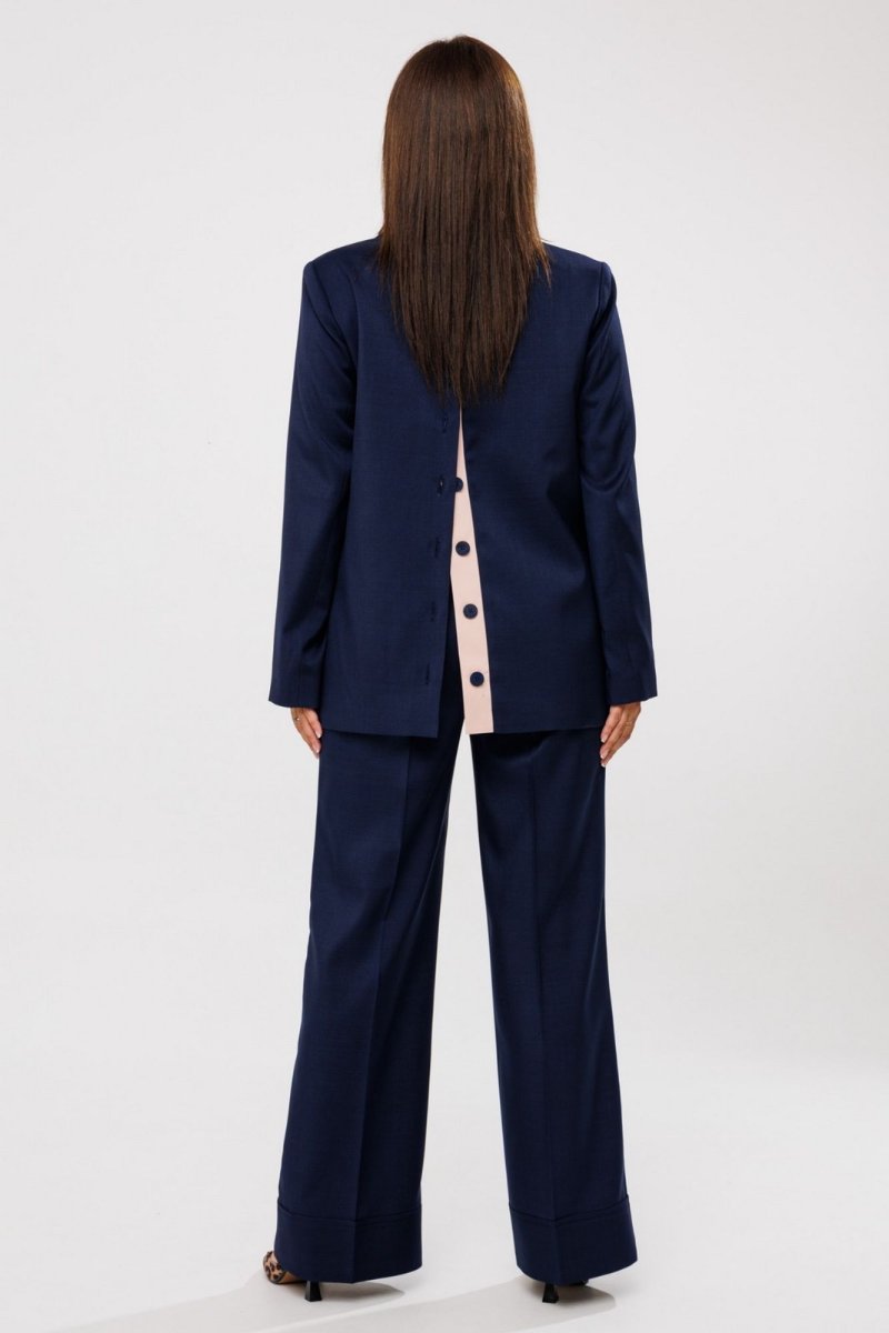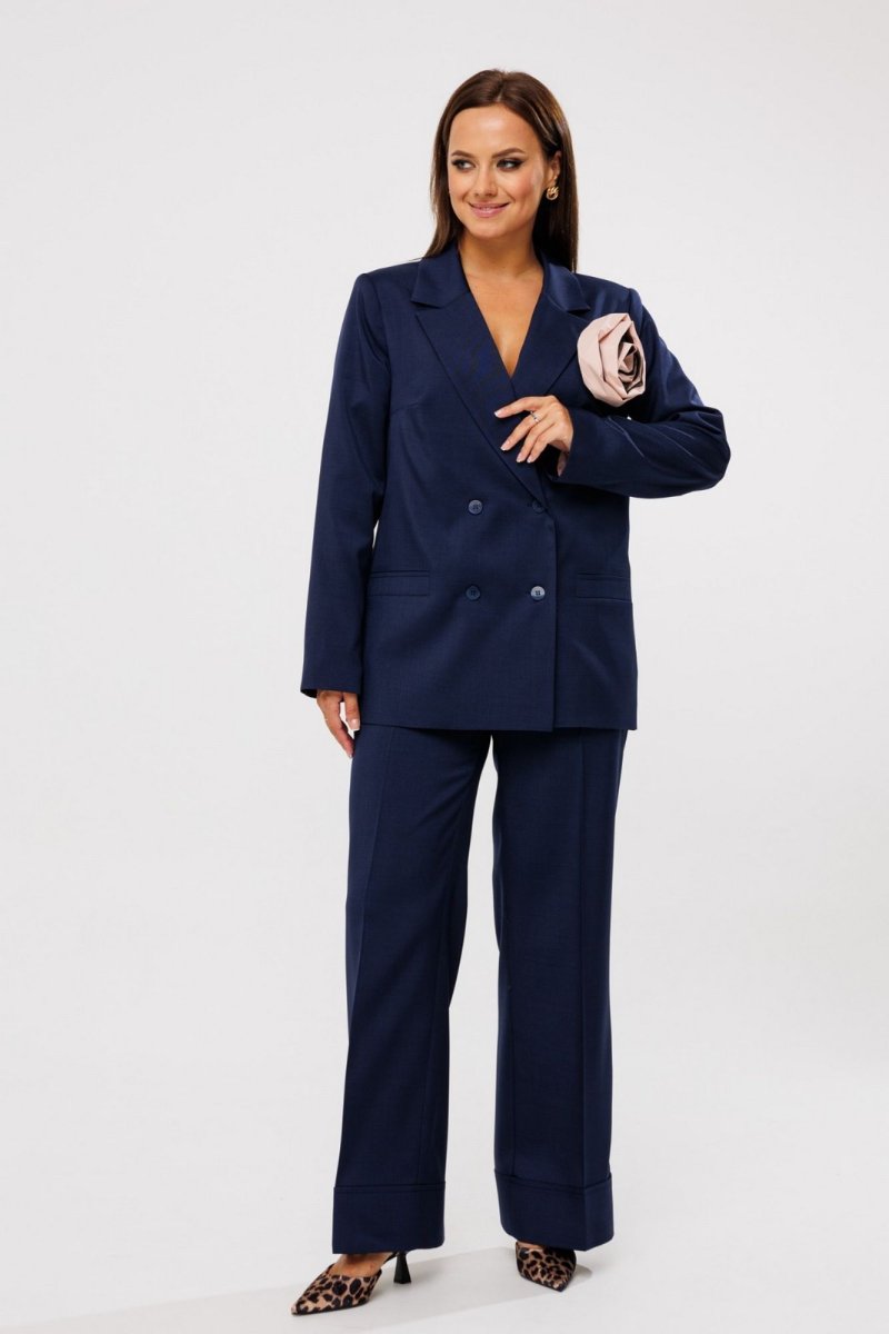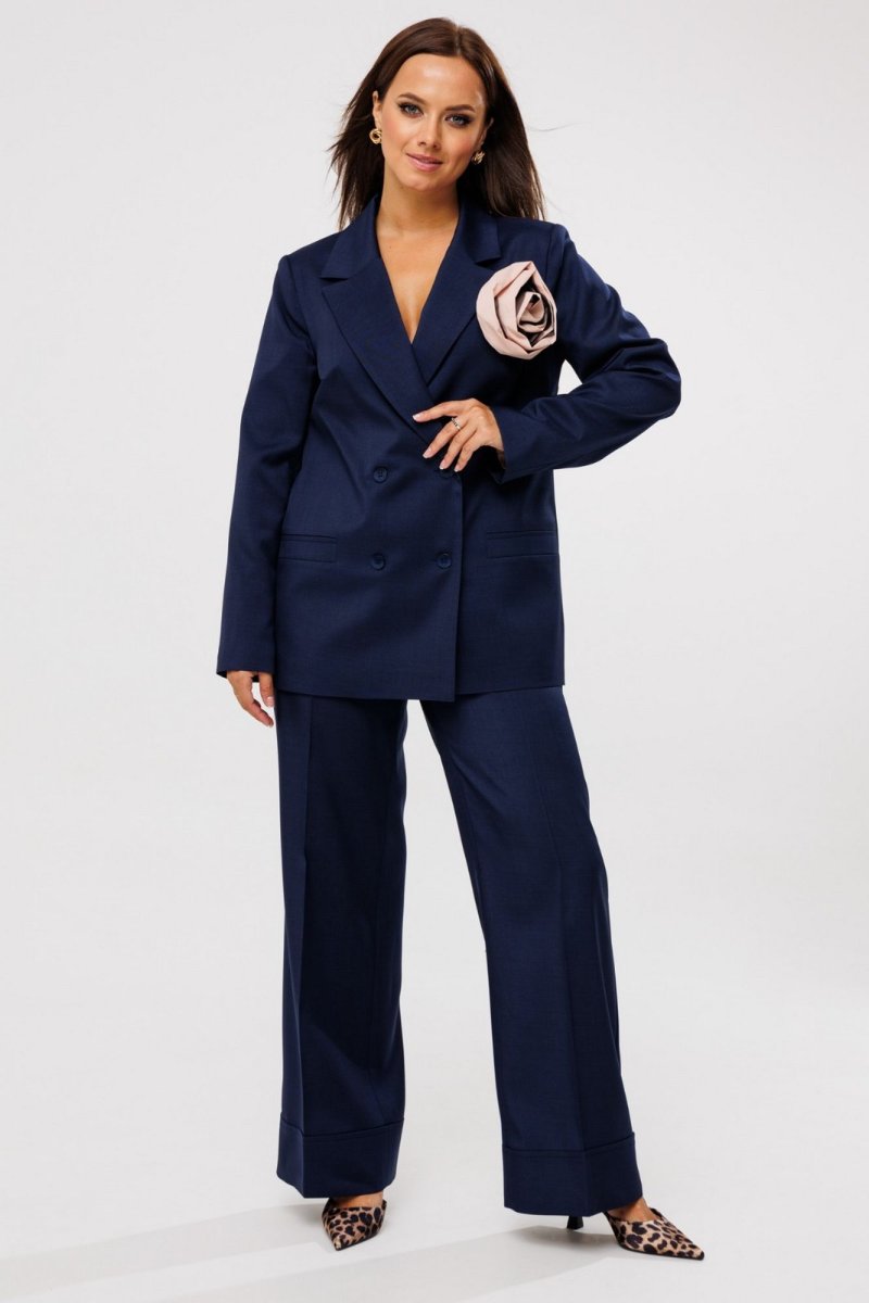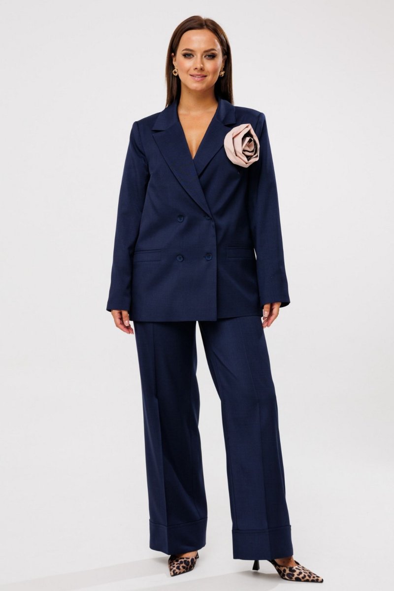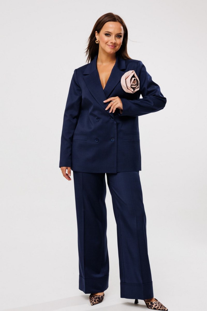 Жакет прямого кроя на подкладке. По переду нагрудные вытачки, функциональные карманы с листочкой, центральная двубортная застежка на петли-пуговицы. Горловина оформлена воротником пиджачного типа с лацканом. Спинка со средним швом, шлицей-планкой из отделочной ткани, застегивающейся на петли-пуговицы. Рукава втачные, двухшовные. Жакет декорирван съемным цветком из отделочной ткани.