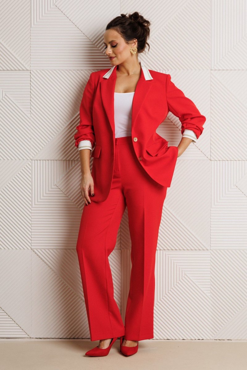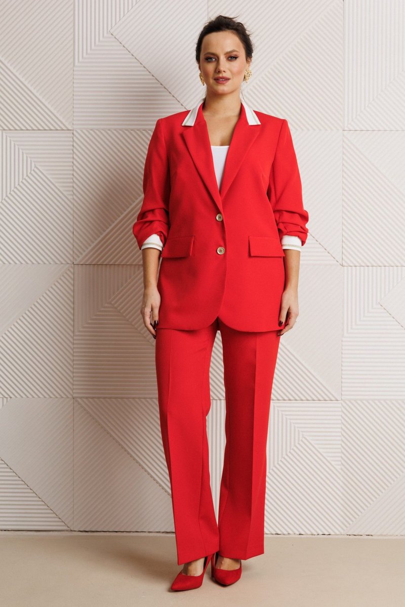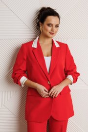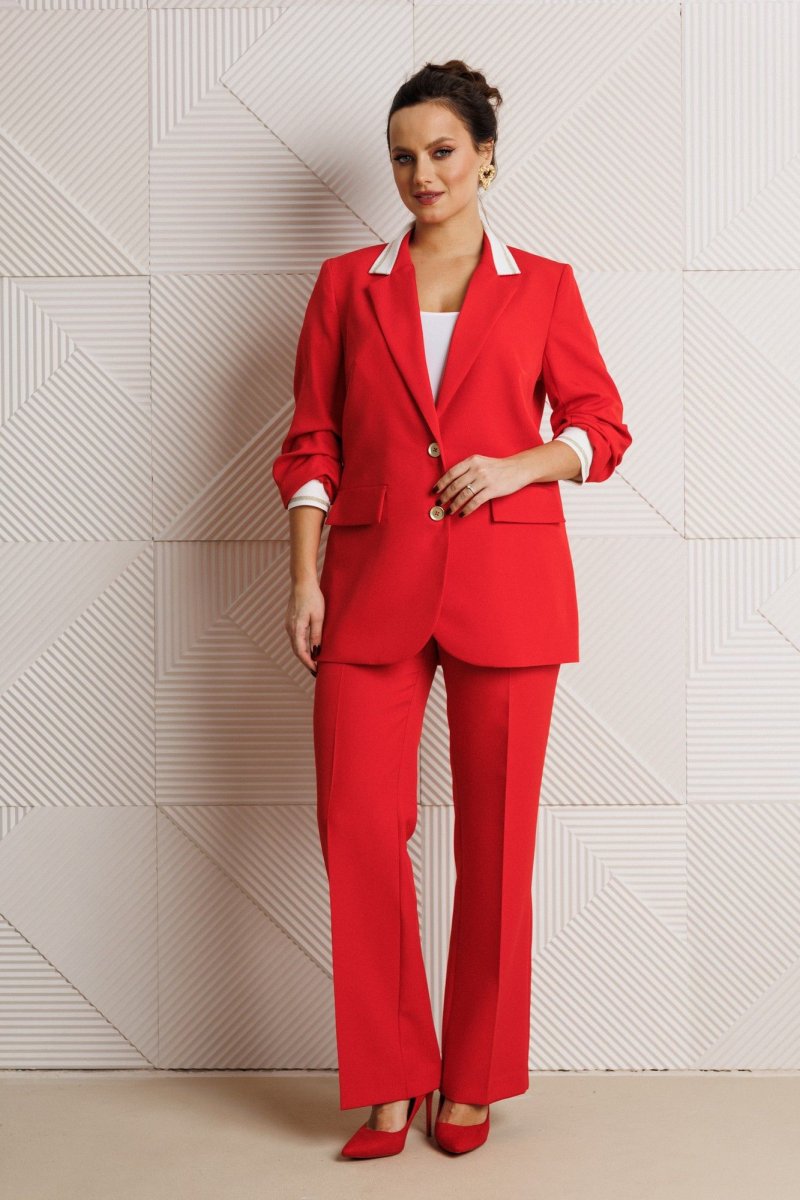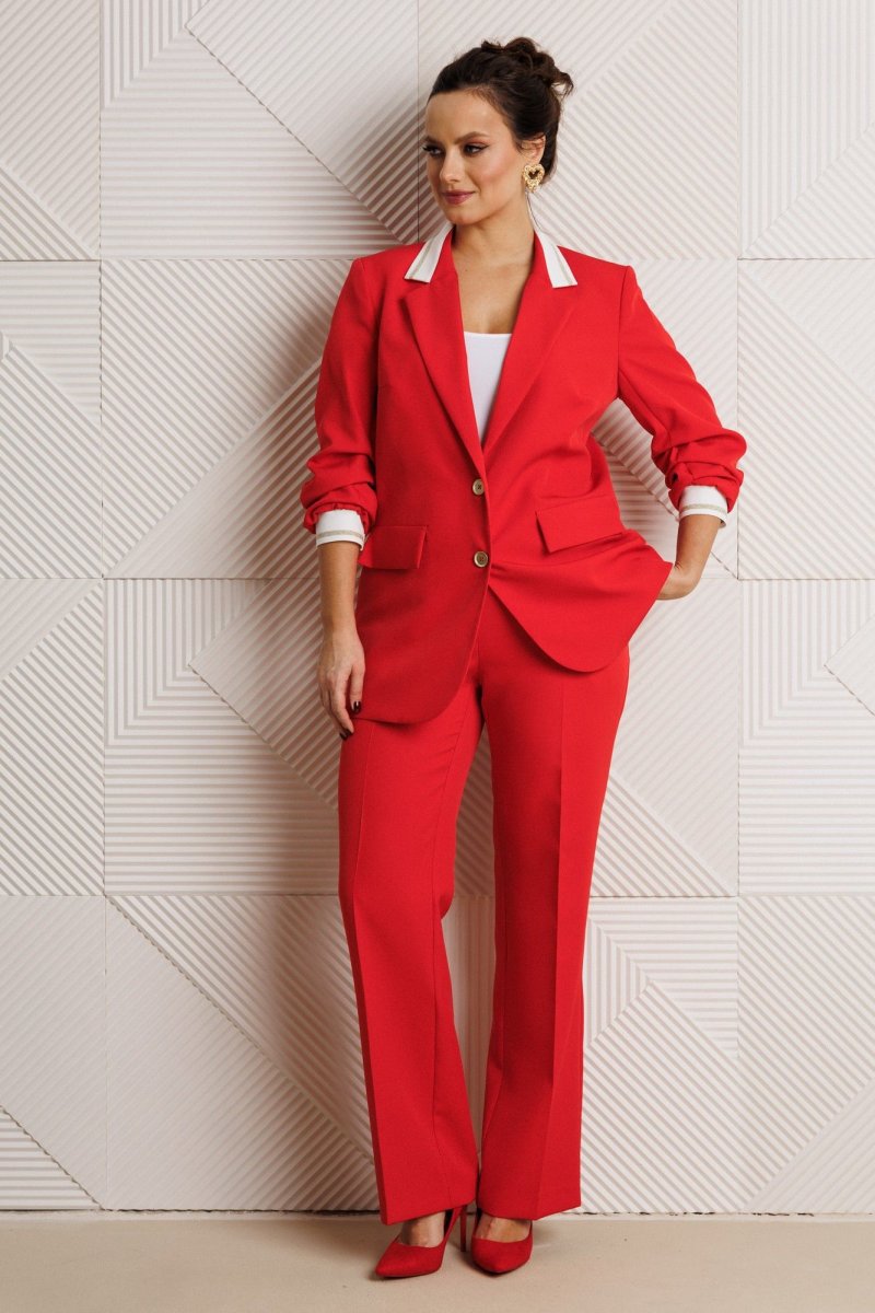 Жакет полуприлегающего силуэта, выполнен из костюмной ткани (не тянется) с отделкой из довяза на подкладке. Перед с нагрудными вытачками и настрочными клапанами. Застежка центральная на петли-пуговицы. Горловина оформлена воротником пиджачного типа с лацканом. Спинка со средним швом. Рукава втачные, двухшовные с мягкими складками и манжетой из довяза. Брюки свободного прямого кроя с высокой посадкой из костюмной ткани (тянется). В боковых швах функциональные карманы. По срезу банта – застежка-молния. Верхний срез оформлен поясом с эластичной резинкой по задней половинке.