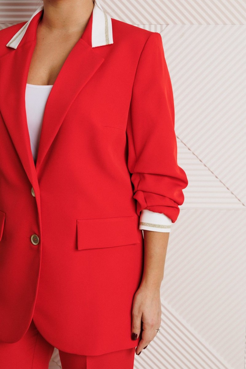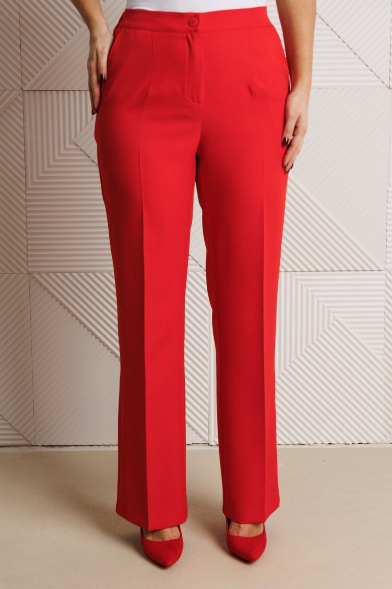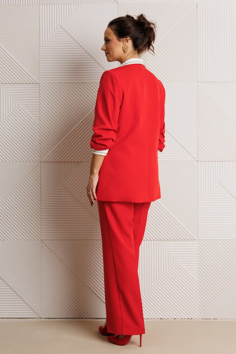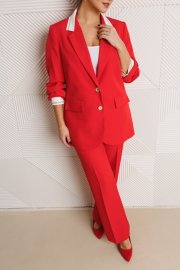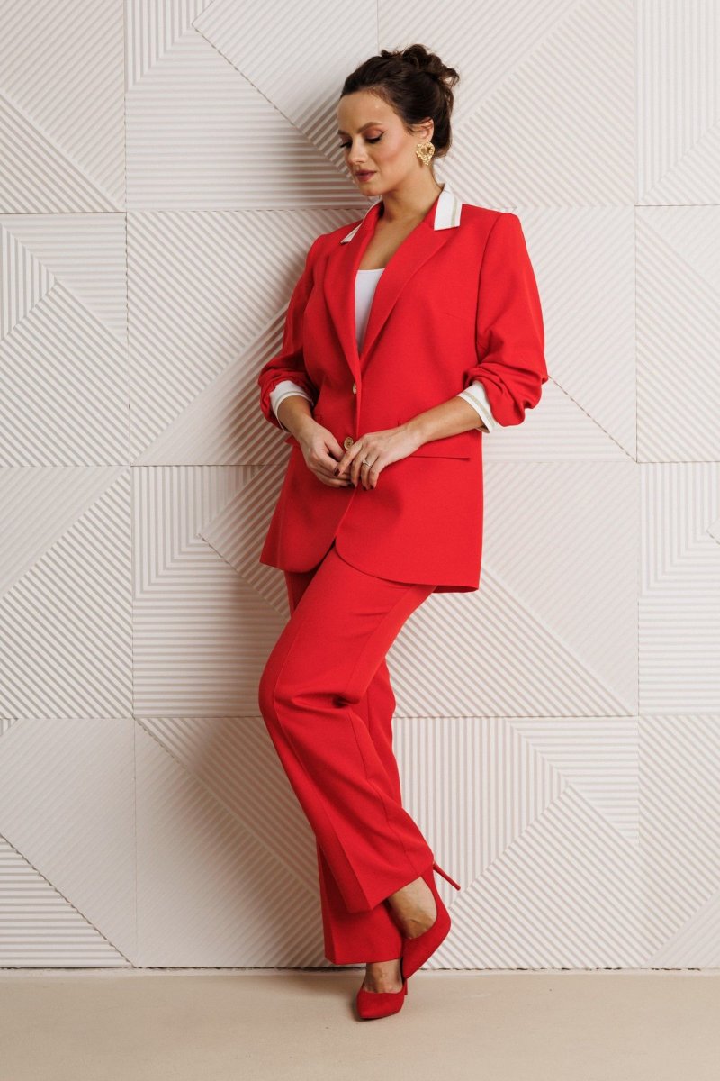 Жакет полуприлегающего силуэта, выполнен из костюмной ткани (не тянется) с отделкой из довяза на подкладке. Перед с нагрудными вытачками и настрочными клапанами. Застежка центральная на петли-пуговицы. Горловина оформлена воротником пиджачного типа с лацканом. Спинка со средним швом. Рукава втачные, двухшовные с мягкими складками и манжетой из довяза. Брюки свободного прямого кроя с высокой посадкой из костюмной ткани (тянется). В боковых швах функциональные карманы. По срезу банта – застежка-молния. Верхний срез оформлен поясом с эластичной резинкой по задней половинке.