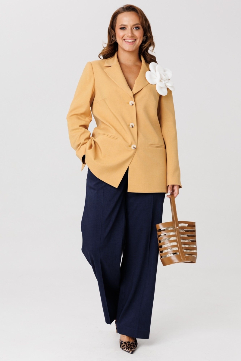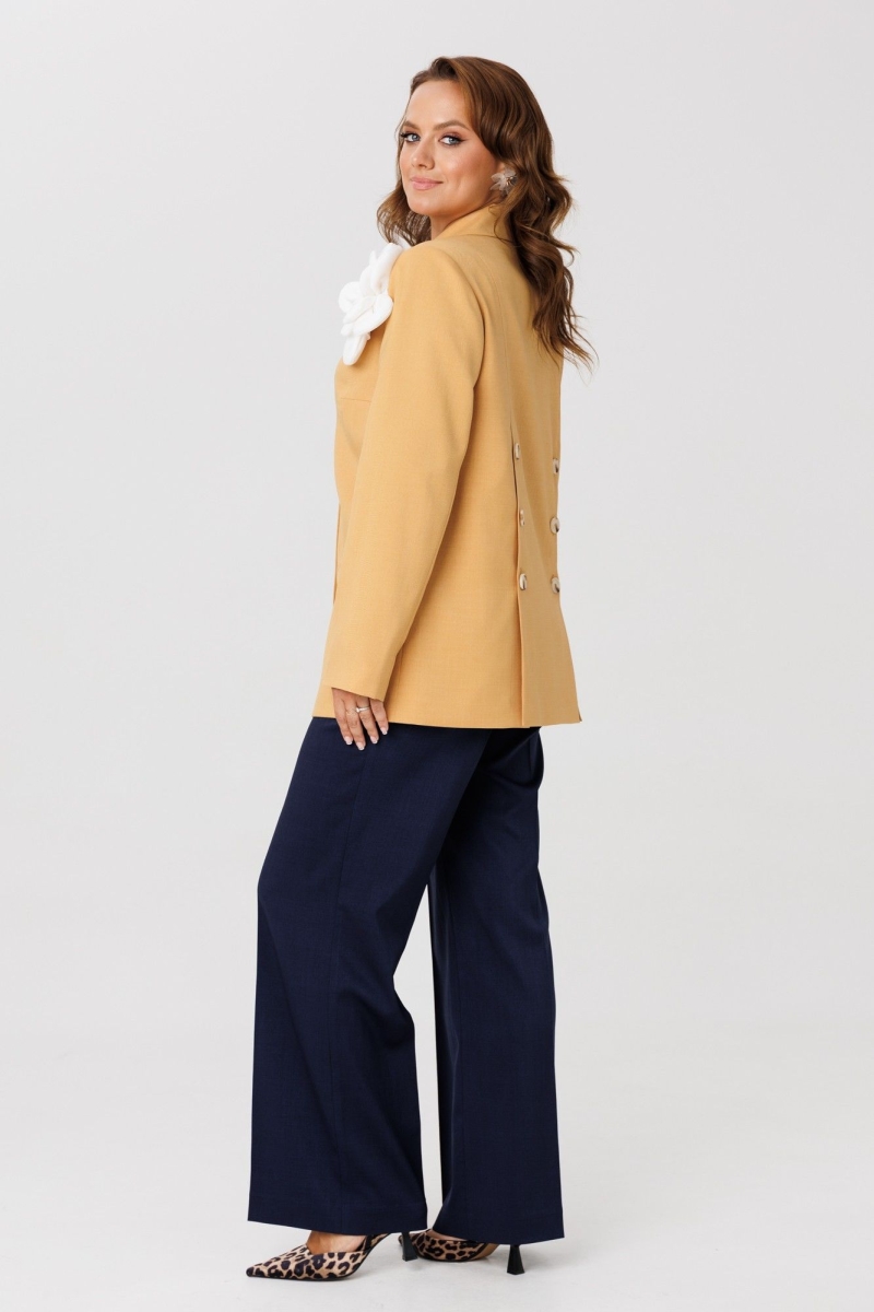 Стильный женский костюм, состоящий из жакета и брюк, изготовлен из костюмной ткани (чуть тянется). Жакет прямого силуэта. По переду нагрудные вытачки. Воротник с отложными бортами пиджачного типа. Застежка на три петли-пуговицы. На полочке функциональные карманы. Спинка с рельефами, переходящими в шлицу. На шлице застежка на три петли-пуговицы. Рукав втачной, двухшовный. Жакет на подкладке. Декоративным элементом является съемный цветок. Брюки свободного кроя с высокой посадкой. В боковых швах функциональные карманы. Верхний срез брюк оформлен поясом с резинкой в боковых швах. Застежка в брюках на тесьму-молнию.