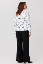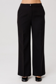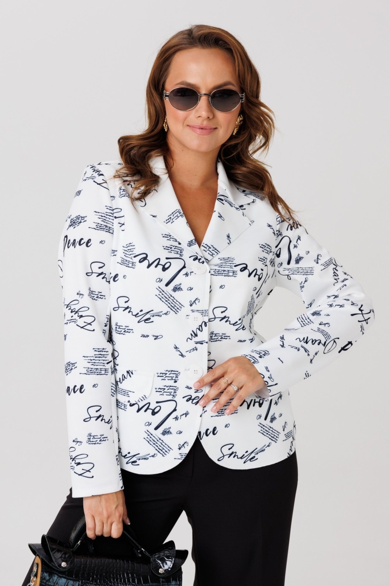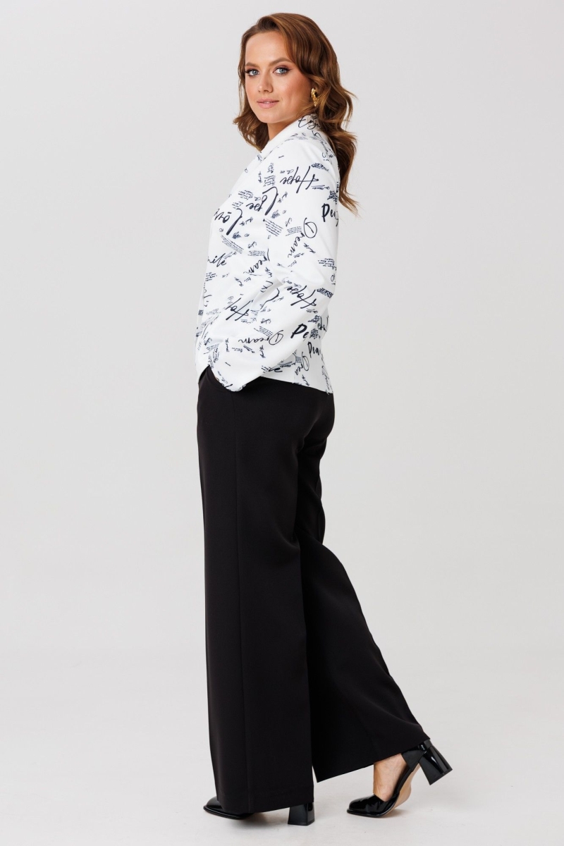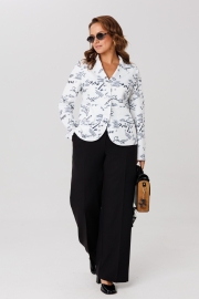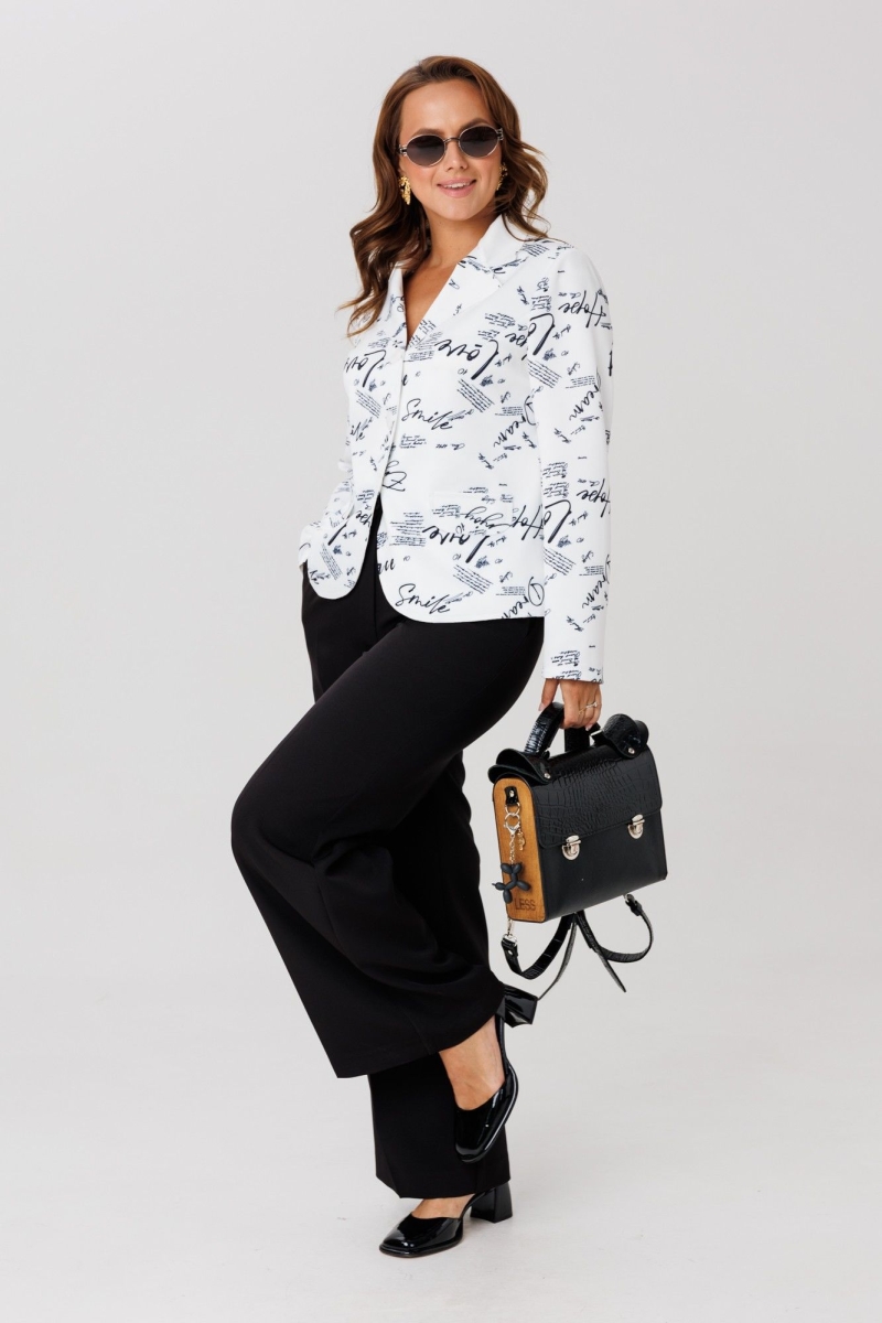 Нарядный женский костюм, состоящий из жакета и брюк. Жакет полуприлегающего силуэта, выполнен из трикотажного полотна (тянется), без подкладки. По переду нагрудная вытачка и отделочный клапан, центральная застежка на петли-пуговицы. Спинка со средними рельефными швами. Рукава втачные, двухшовные. Горловина оформлена воротником пиджачного типа с лацканом. Брюки прямого классического кроя с высокой посадкой, выполнены из костюмной ткани (чуть тянется) с наклонными карманами в боковых швах. По срезу банта – застежка-молния. Верхний срез оформлен поясом с эластичной резинкой по задней половинке.